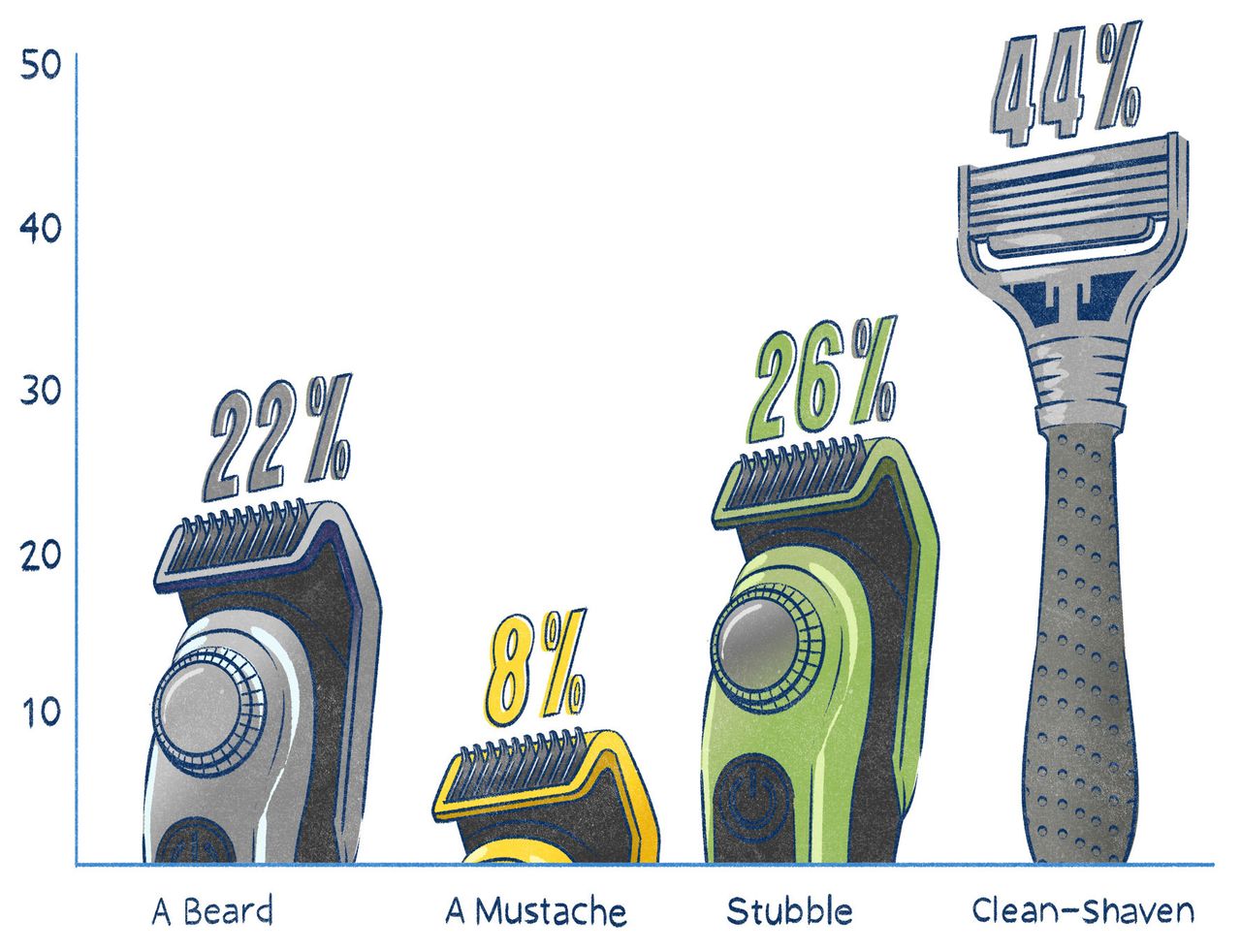 插圖:保羅·圖勒儘管44%的受訪者認為乾淨剃鬚的臉最性感,但高達56%的人偏愛某種鬍鬚——三個不同毛髮類型分散了這部分選票。