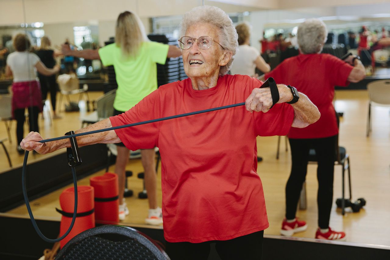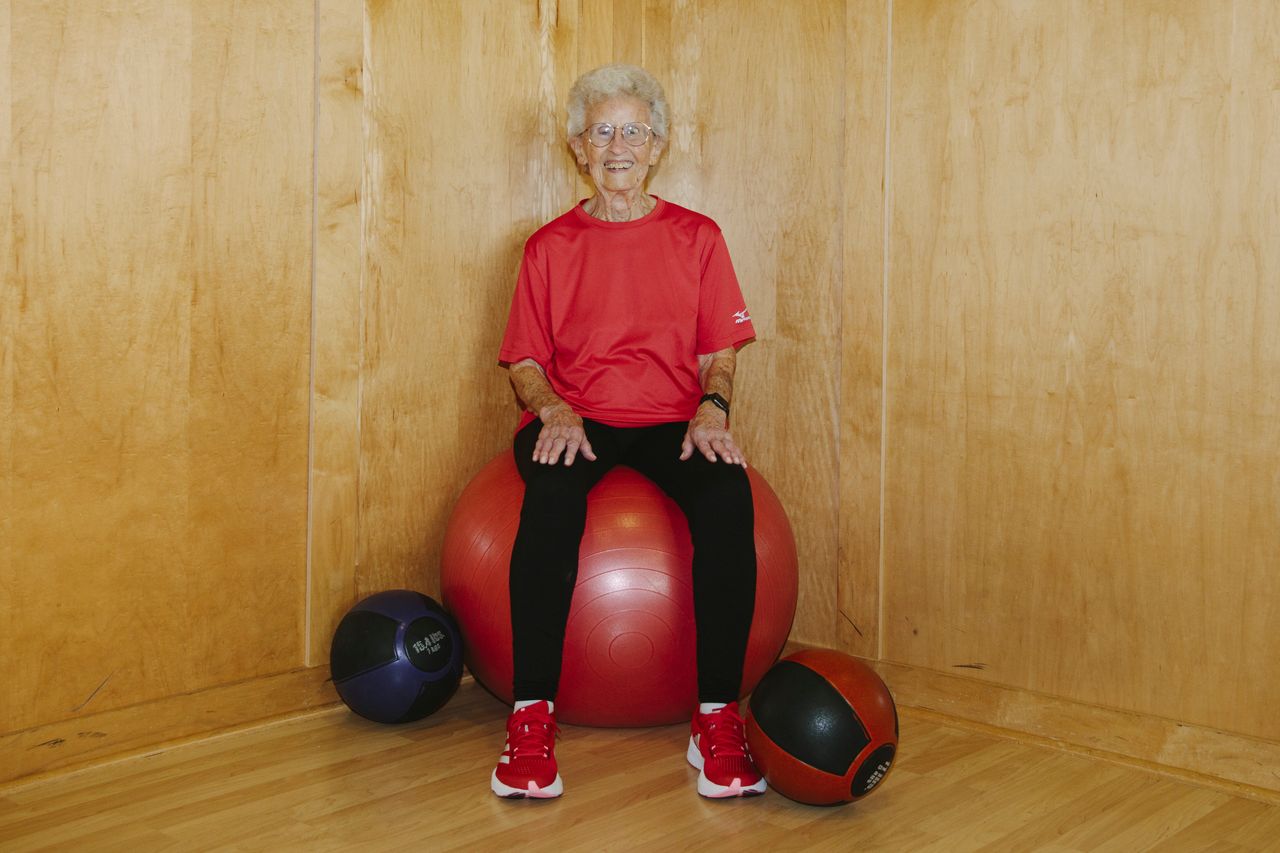每週三天,她和女兒凱瑞·麥克布萊德會參加亞特蘭大巴克海特社區LA Fitness的"老年健身"團體課程。這節50分鐘的課程使用輕量啞鈴、阻力帶和穩定球進行力量訓練。許多以平衡為重點的練習會藉助椅子完成。