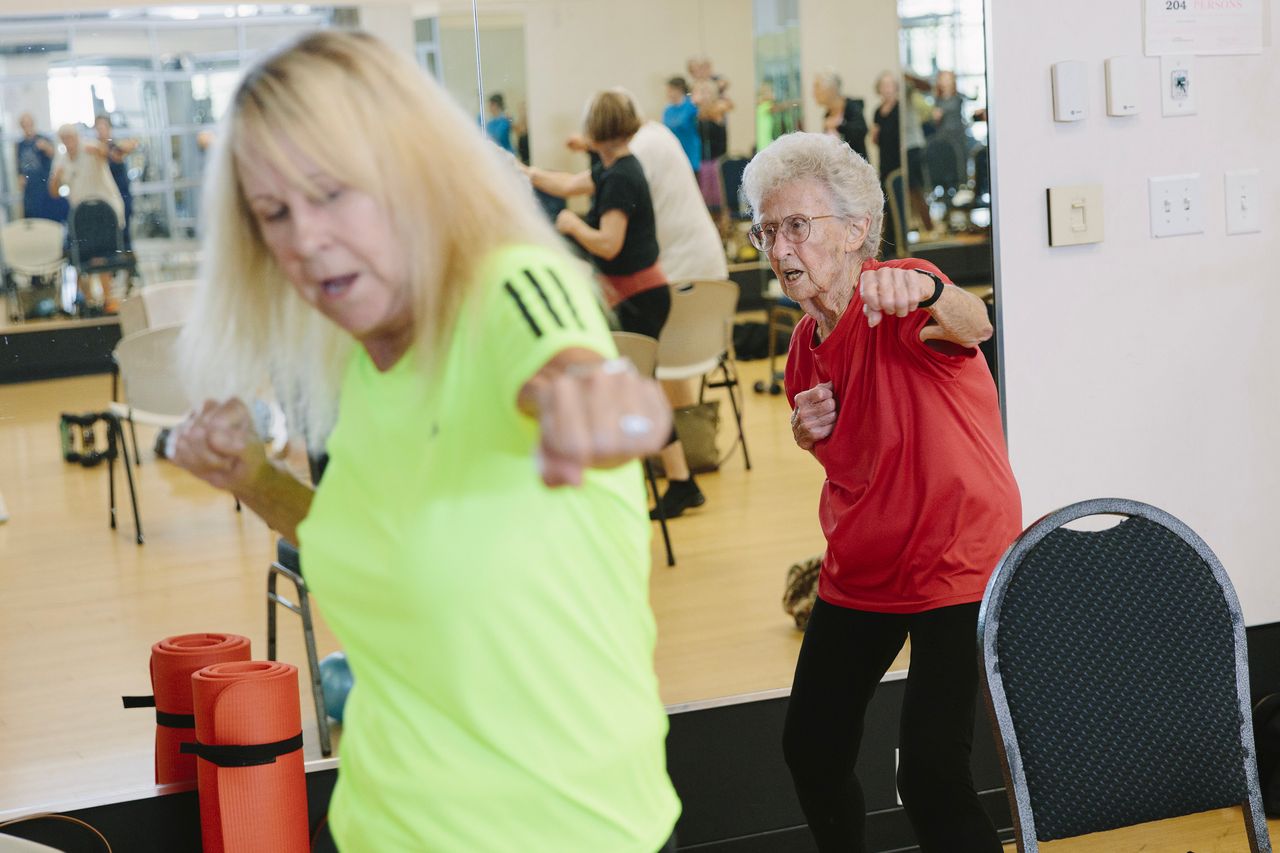 72歲的琳德伯格和女兒凱瑞·麥克布萊德在老年健身課上練習空擊拳。