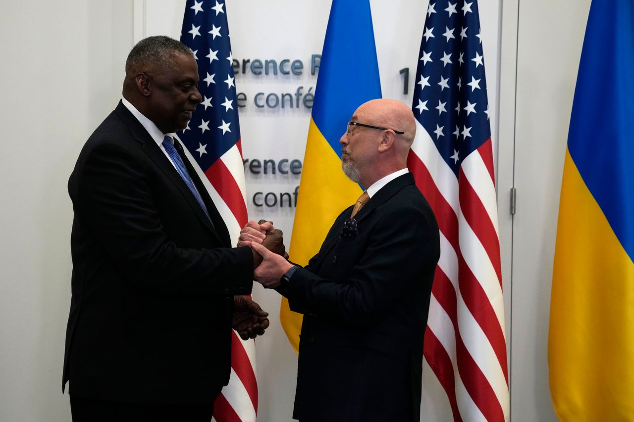 2023年6月15日星期四,美國國防部長勞埃德·奧斯汀(左)在布魯塞爾北約總部舉行的北約國防部長會議期間與烏克蘭國防部長奧列克西·列茲尼科夫會面時致意。圖片來源:弗吉尼亞·梅奧/美聯社