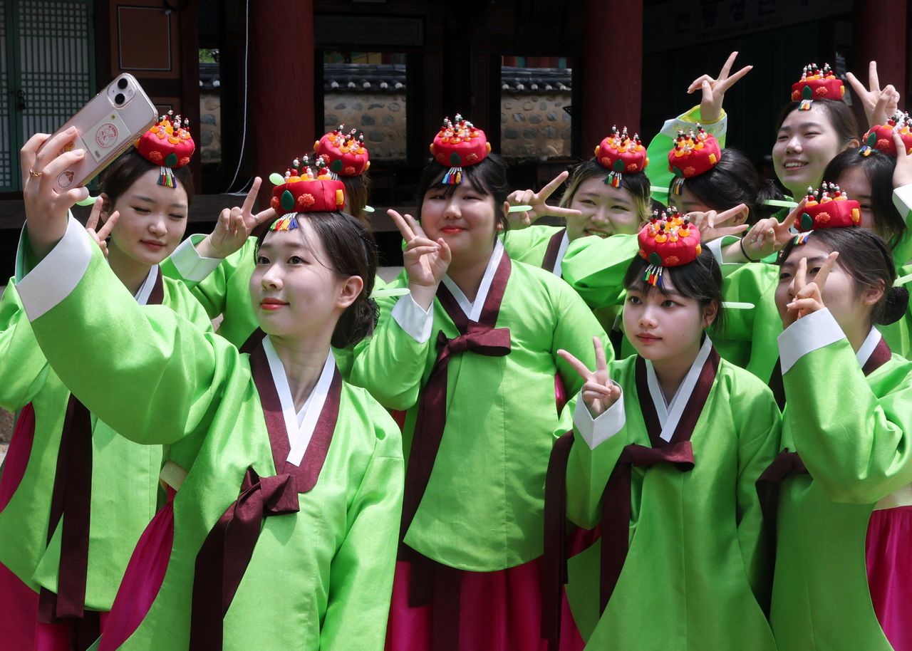 在釜山的一次學校活動中,學生們穿着韓國傳統服裝自拍。照片:Yonhap News/Zuma Press根據韓國教育部發布的指導方針,學生們不應糾結於新的年齡差異。“一開始可能會覺得尷尬,”指導方針補充道。