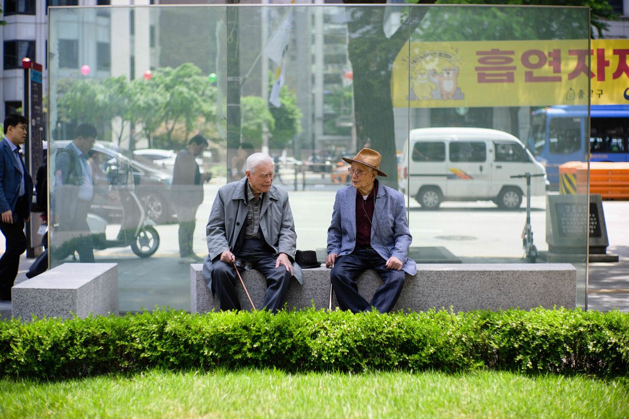五月,兩名男子在首爾聊天。照片:Anthony WALLACE/AFP/Getty Images“韓國正在變得更年輕,”政府在宣佈通過這項扭轉時間的法案時,在新聞稿中如此宣稱。