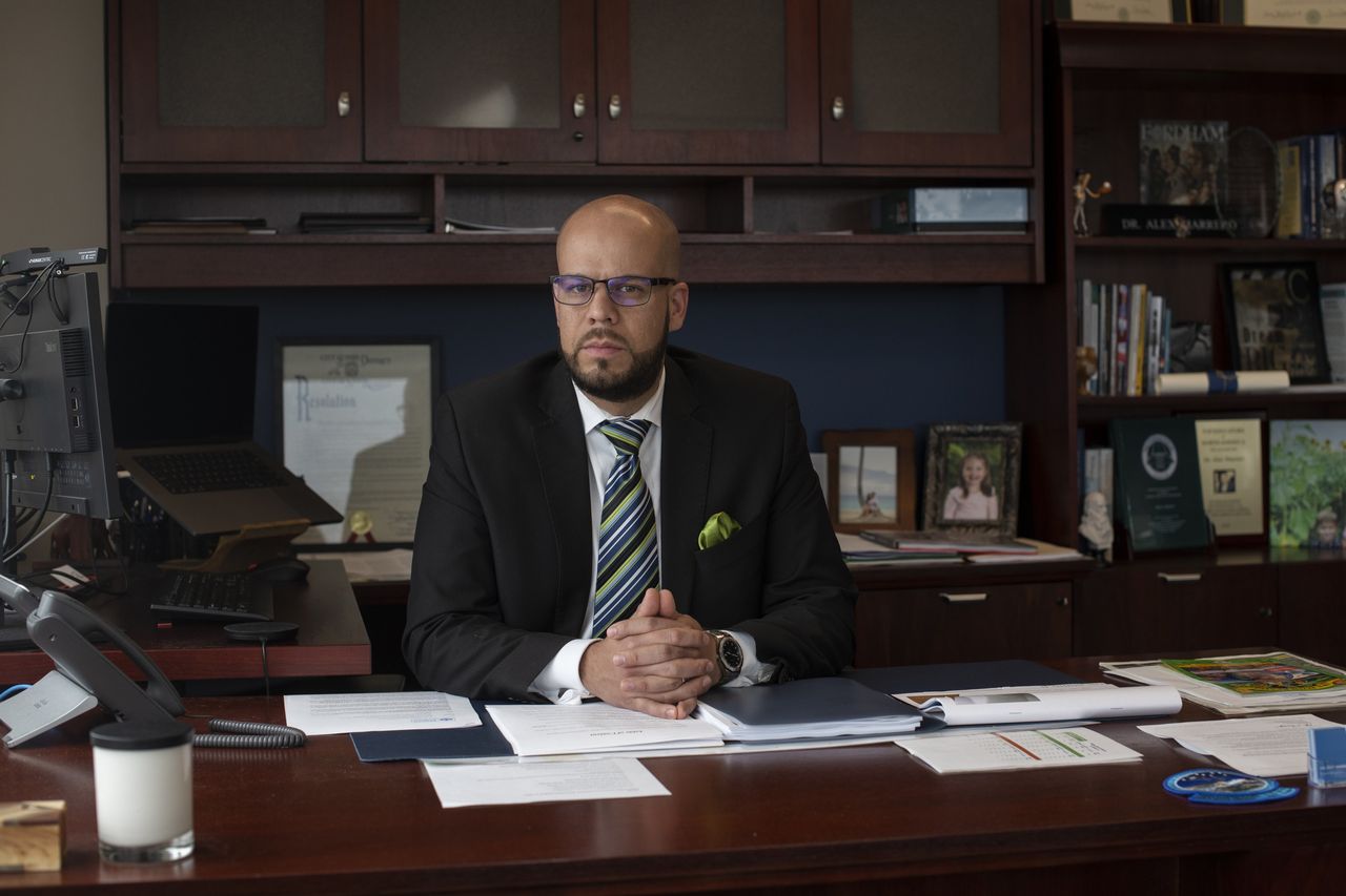 丹佛公立學校學監亞歷克斯·馬雷羅在他的辦公室。2020年喬治·弗洛伊德被殺後,學校董事會一致投票決定將該地區的17名丹佛警察局警官從18所初高中校園調離。美國各地超過30個學區也終止了校園警務項目。