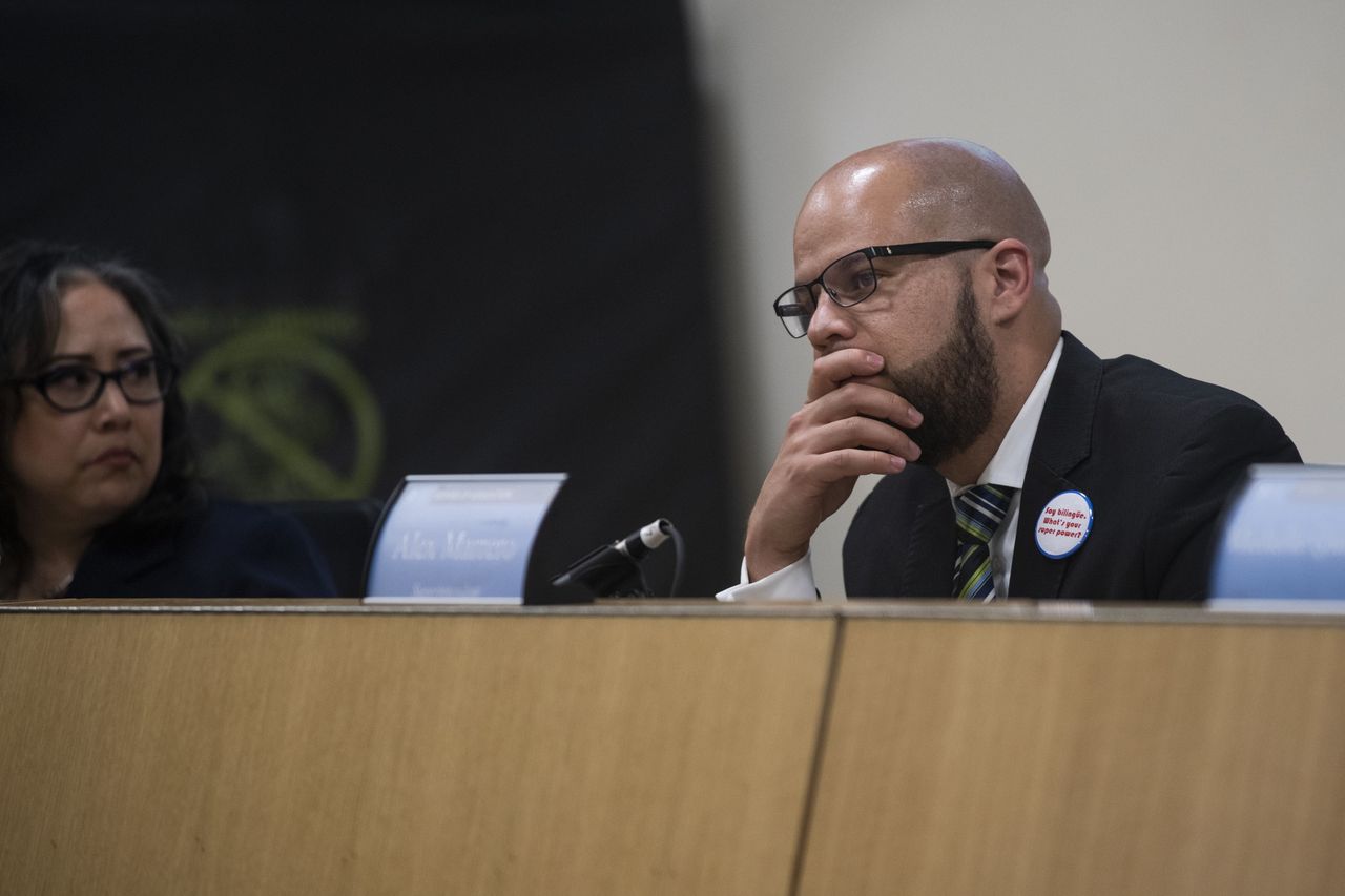 5月15日學校董事會會議上,教育局長亞歷克斯·馬雷羅(右)與董事會主席索奇特爾·加伊坦。在陣亡將士紀念日週末前,馬雷羅發佈了第二版計劃草案,其中指出董事會需要就全區恢復駐警制度作出決定。