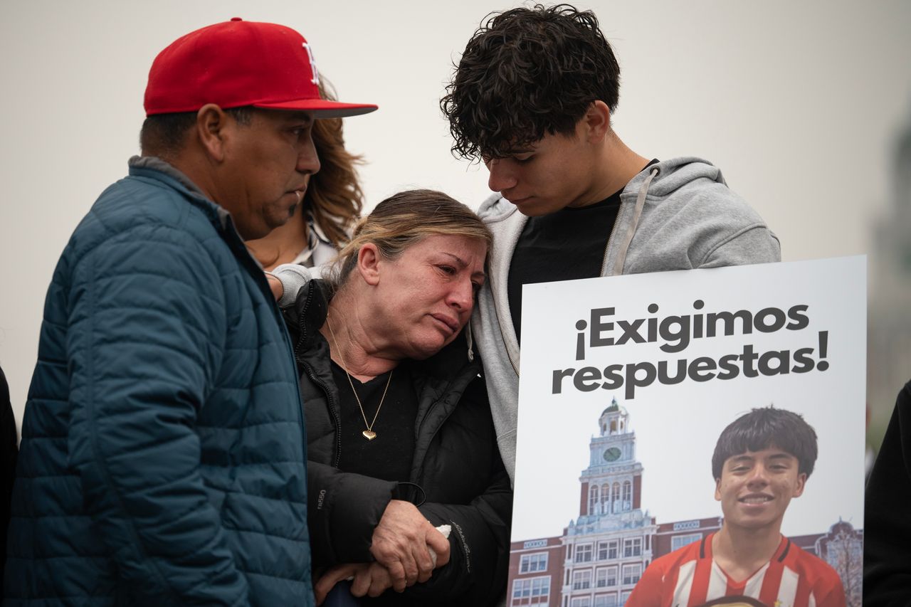 克里斯爾達·博巴迪拉·桑多瓦爾(中)是海報上男孩路易斯·加西亞的母親,海報上寫着“我們要求答案!”。在新聞發佈會上,她與男孩的父親桑托斯·加西亞(左)和另一個同樣名叫桑托斯·加西亞的兒子站在一起。照片:蒂莫西·赫斯特/丹佛公報/美聯社路易斯的家人在家長組織的新聞發佈會上發言,支持讓警察重返校園。“我們不想要100、200名警察,”遇害男孩的父親桑托斯·加西亞説。“但我們希望有一點安全保障,讓學生們感到安全。”