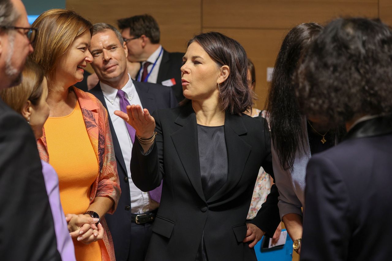 身着黑衣的德國外交部長安娜萊娜·貝爾伯克表示,其政府將在年底前向烏克蘭增派防空坦克。圖片來源:朱利安·瓦爾南德/祖馬通訊社烏克蘭外交部長德米特羅·庫列巴通過視頻連線參會時表示,在基輔試圖突破俄軍防線卻進展緩慢且傷亡慘重之際,加強對俄製裁與向烏提供新軍事援助至關重要。
