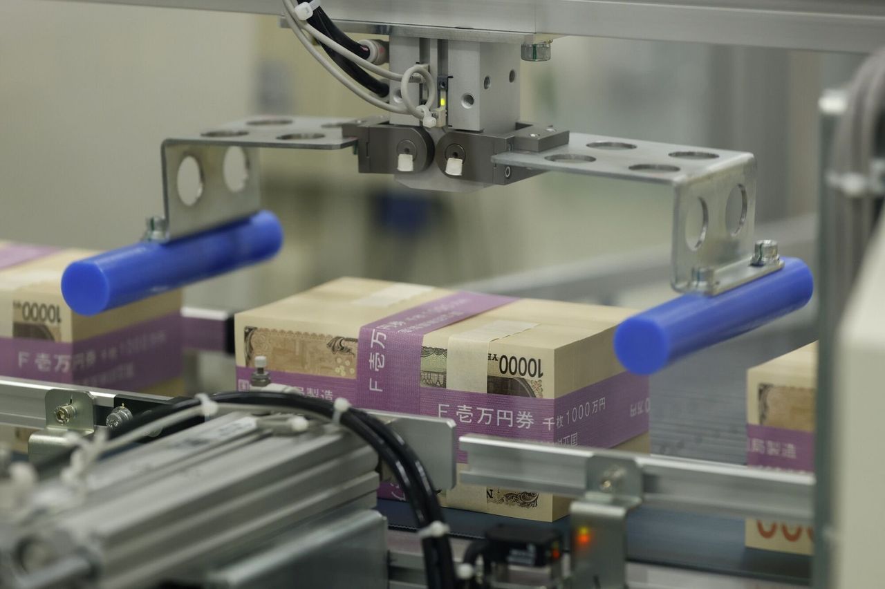 一疊新設計的日本1萬日元紙幣在東京國立印刷局工廠的傳送帶上移動。圖片來源:Kiyoshi Ota/彭博新聞分析師表示,由於預期日本與大多數其他國家之間的利率差距可能進一步擴大並損害日元,未來幾個月日元可能會進一步走弱。