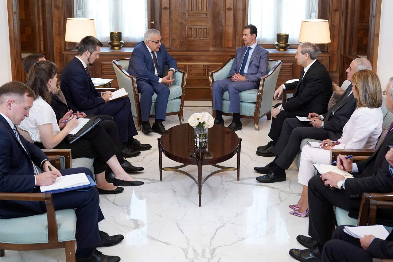 敍利亞阿拉伯通訊社週一發佈的圖片,顯示敍利亞總統巴沙爾·阿薩德(中右)和俄羅斯副外長謝爾蓋·韋爾希寧在大馬士革。圖片來源:SANA/法新社/蓋蒂圖片社