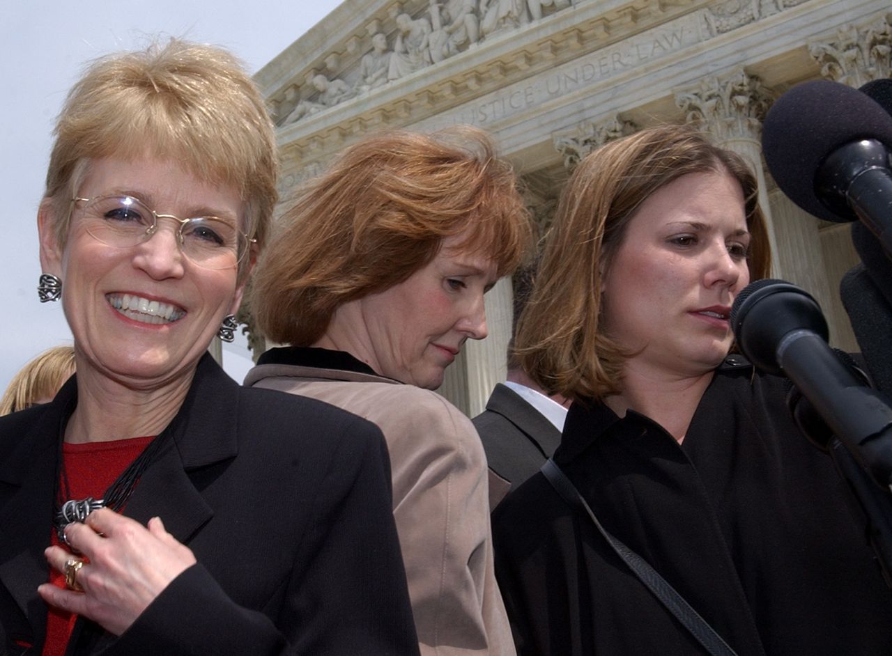 2003年,密歇根大學校長瑪麗·蘇·科爾曼(左)與原告芭芭拉·格魯特和詹妮弗·格拉茨在最高法院外。圖片來源:蘇珊·沃爾什/美聯社