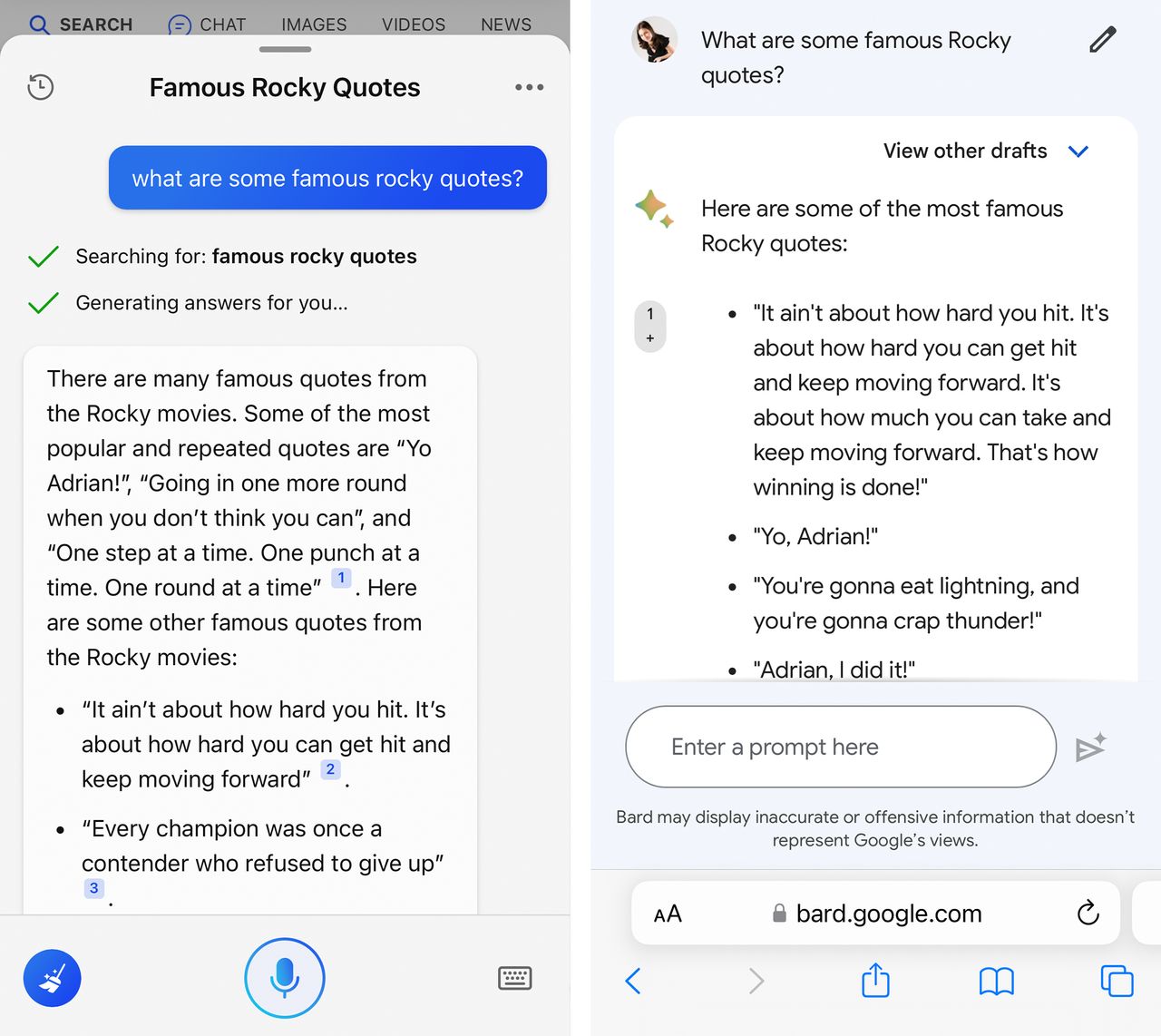 微軟必應與谷歌Bard在引用洛奇·巴爾博亞台詞上的較量。圖片來源:喬安娜·斯特恩/華爾街日報還有微軟的必應,這個幾乎被遺忘的老產品變成了有趣的新玩具——也對谷歌構成了新的潛在威脅。必應通過數十億美元的合作整合了OpenAI技術。以友善著稱的CEO薩提亞·納德拉(微軟)和桑達爾·皮查伊(谷歌)雖然不會真的走上拳擊台,但已經展開了一場沒有硝煙的戰爭。