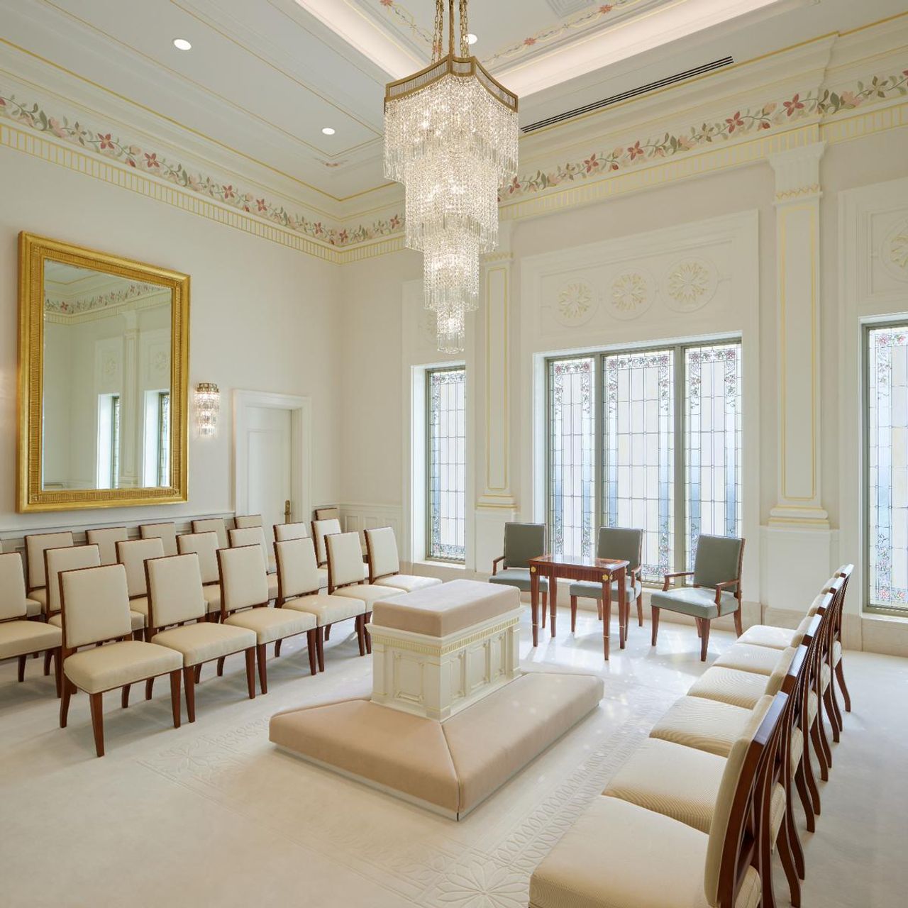 愛達荷州波卡特洛新聖殿內的"印證室”。聖殿的石灰岩地材採自伯利恆,門板木材則從剛果河流域進口。圖片來源:耶穌基督後期聖徒教會德州亨茨維爾山姆休斯頓州立大學的本傑明·帕克教授(研究摩門教歷史並著有相關書籍兩本)指出,上世紀90年代末至本世紀初的聖殿建設熱潮中,教會更注重成本效益和極簡設計,強調儀式本身而非建材。“如今出現新趨勢,材料本身成為彰顯虔誠的重要載體。”
