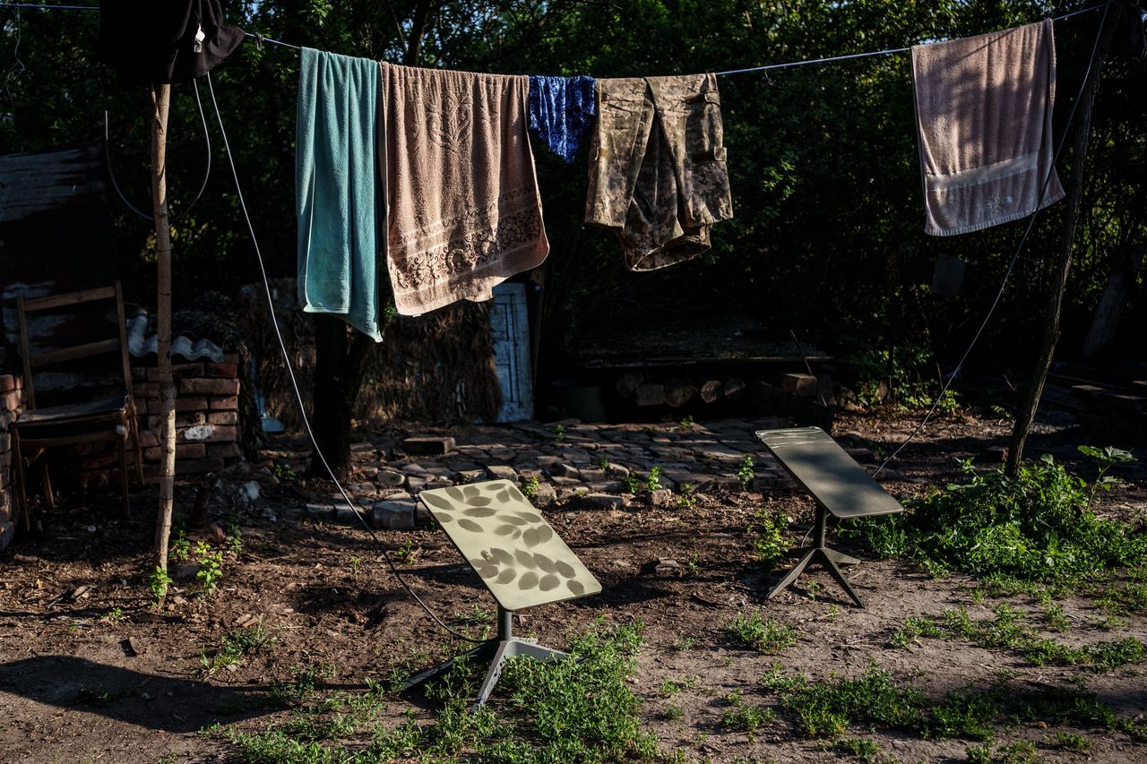 烏克蘭無人機小組成員將洗好的衣物晾曬在農舍旁的天線邊,這裏是指揮中心所在地。
