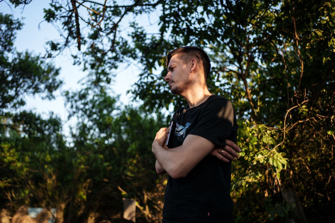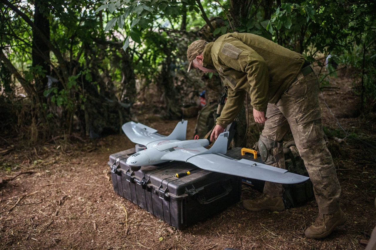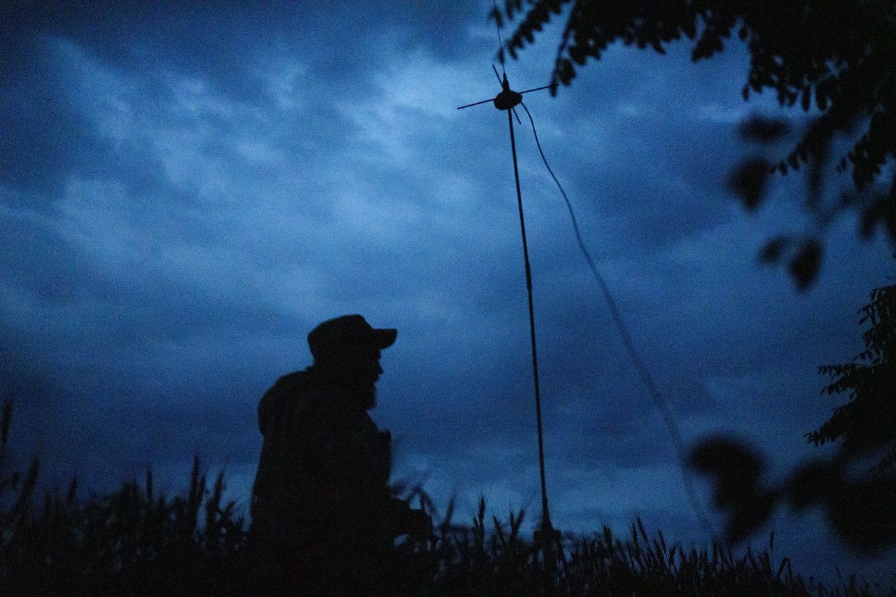 扎波羅熱地區某村莊內的一名烏克蘭指揮官。每天黎明前,小隊就有多架無人機升空——通常是幾架小型商用螺旋槳無人機,有時還會出動更先進的機型,包括美製RQ-20"美洲獅"無人機,這種形似微型飛機的設備具備更遠航程。飛行員在距離前線數英里處操控這些無人機。