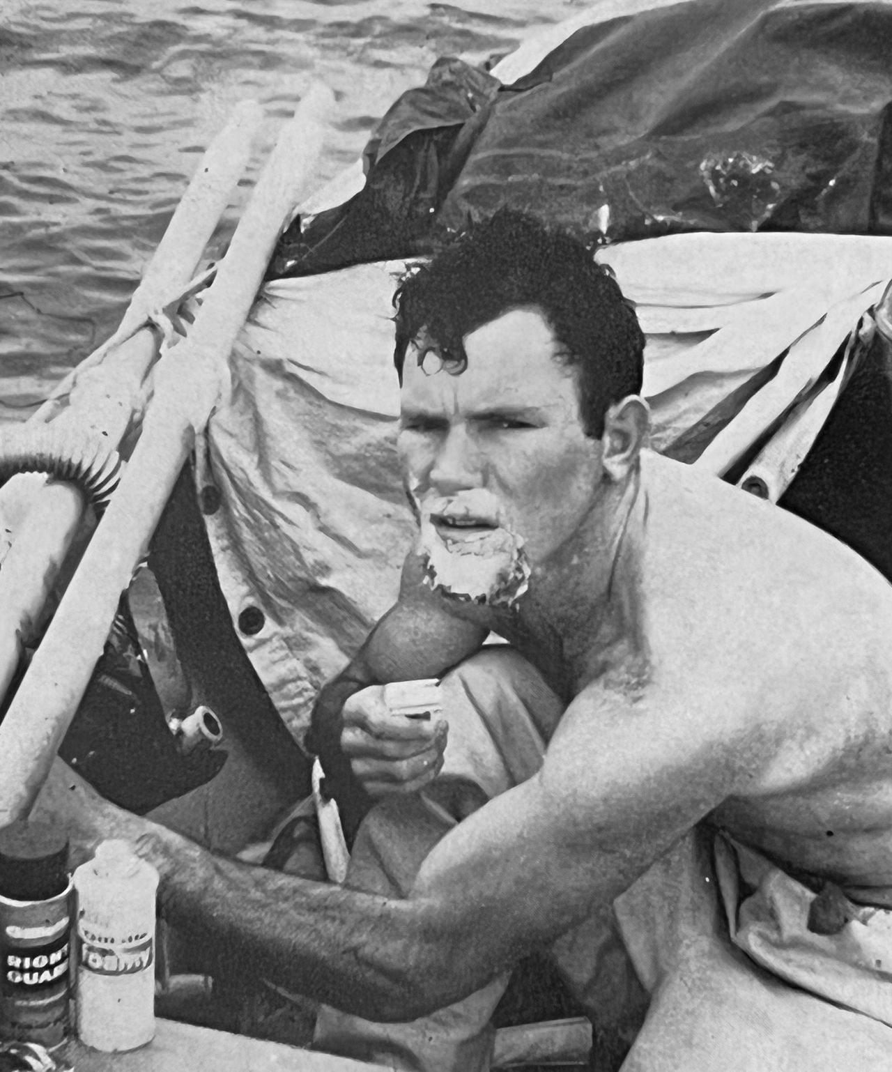 湯姆·麥克萊恩在大西洋中部刮鬍子。照片:湯姆·麥克萊恩1969年夏天,約翰·費爾法克斯正身處加勒比海某處。約半年前,他從西班牙加那利羣島出發,駕駛24英尺長的"不列顛尼亞號"小船駛向佛羅里達。與此同時,湯姆·麥克萊恩正朝相反方向航行,從紐芬蘭前往愛爾蘭,駕駛着他20英尺長的"超級銀號"。兩人都希望成為首位單人划船橫渡大西洋的勇士。