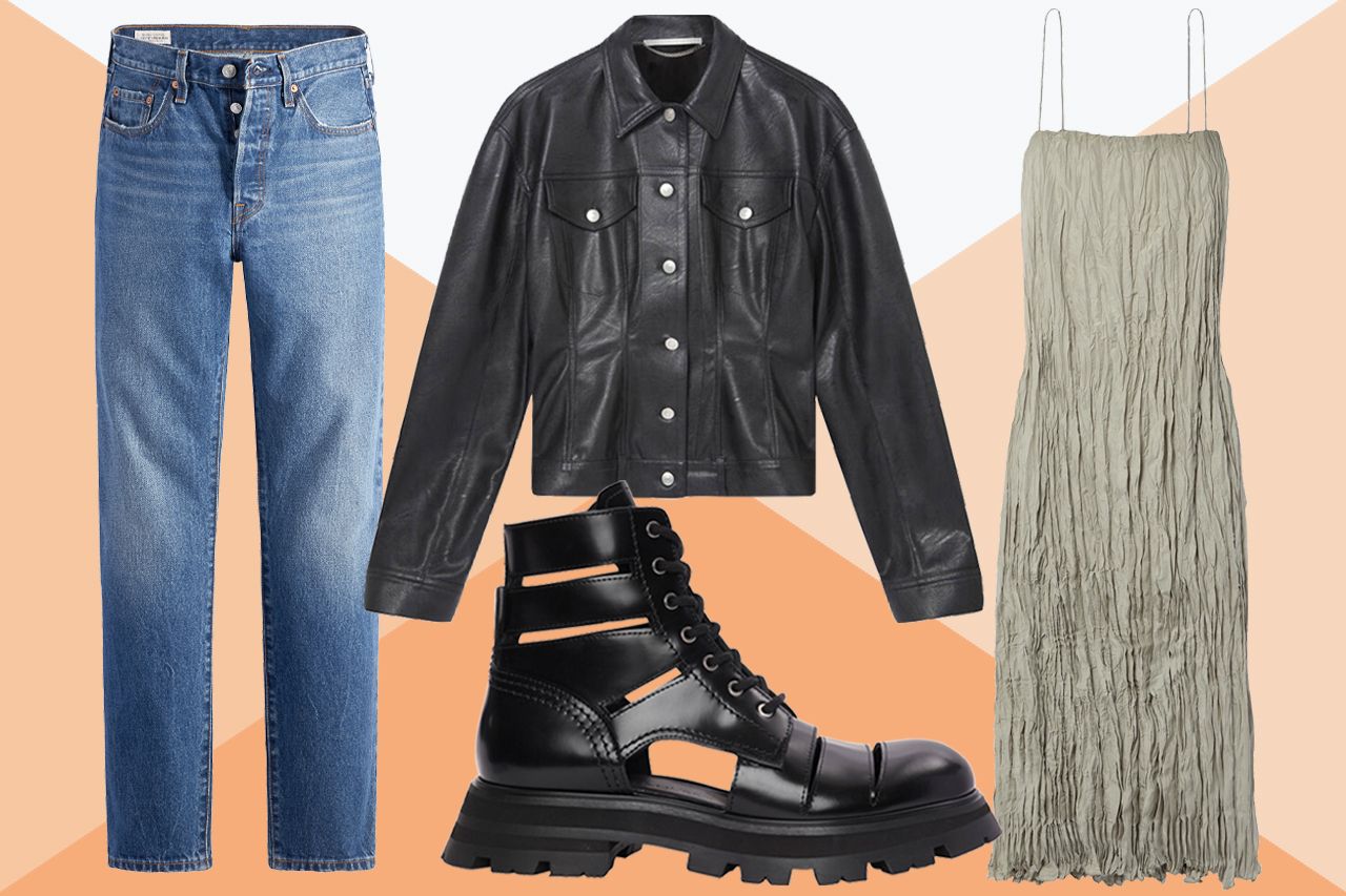 左上起順時針:牛仔褲 108美元 Levi.com;仿皮夾克 1,950美元 StellaMcCartney.com;Toteme真絲裙 596美元 Net-A-Porter.com;皮靴 1,590美元 Alexander McQueen.com照片:Net-A-Porter (Toteme)