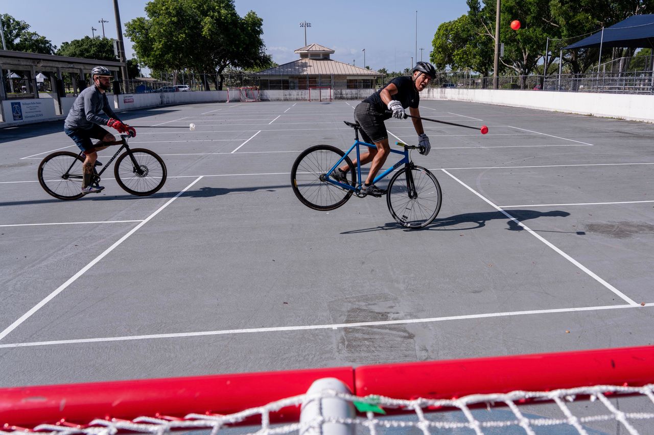 騎手們騎着單速自行車,揮舞着球棍,迎面衝刺,試圖將球擊入3英尺乘6英尺的球門。和曲棍球一樣,這項運動允許身體接觸。頭盔是必備的,碰撞也很常見。