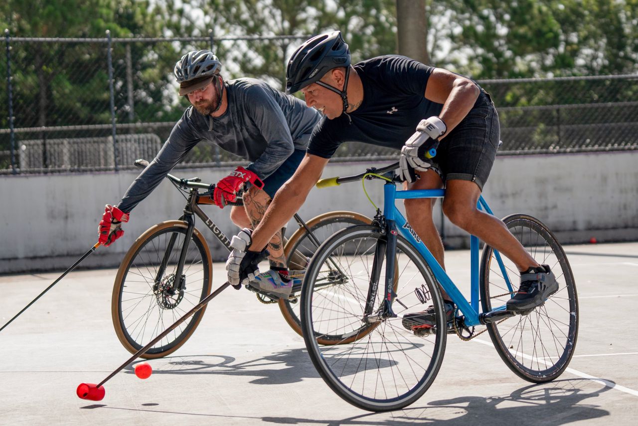 要在自行車馬球運動中取得成功,需要技巧和勇氣,這項運動融合了中世紀的長矛比武、馬球和街頭曲棍球。