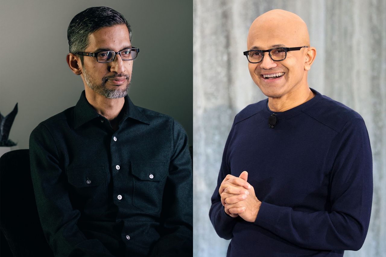 谷歌CEO桑達爾·皮查伊與微軟CEO薩提亞·納德拉圖片來源:(左)《華爾街日報》Helynn Ospina;(右)Jason Redmond/AFP/Getty Images谷歌母公司Alphabet今年股價漲幅較為温和,為39%,但在發佈財報後躍升了6%,該財報未包含任何官方財務預測。