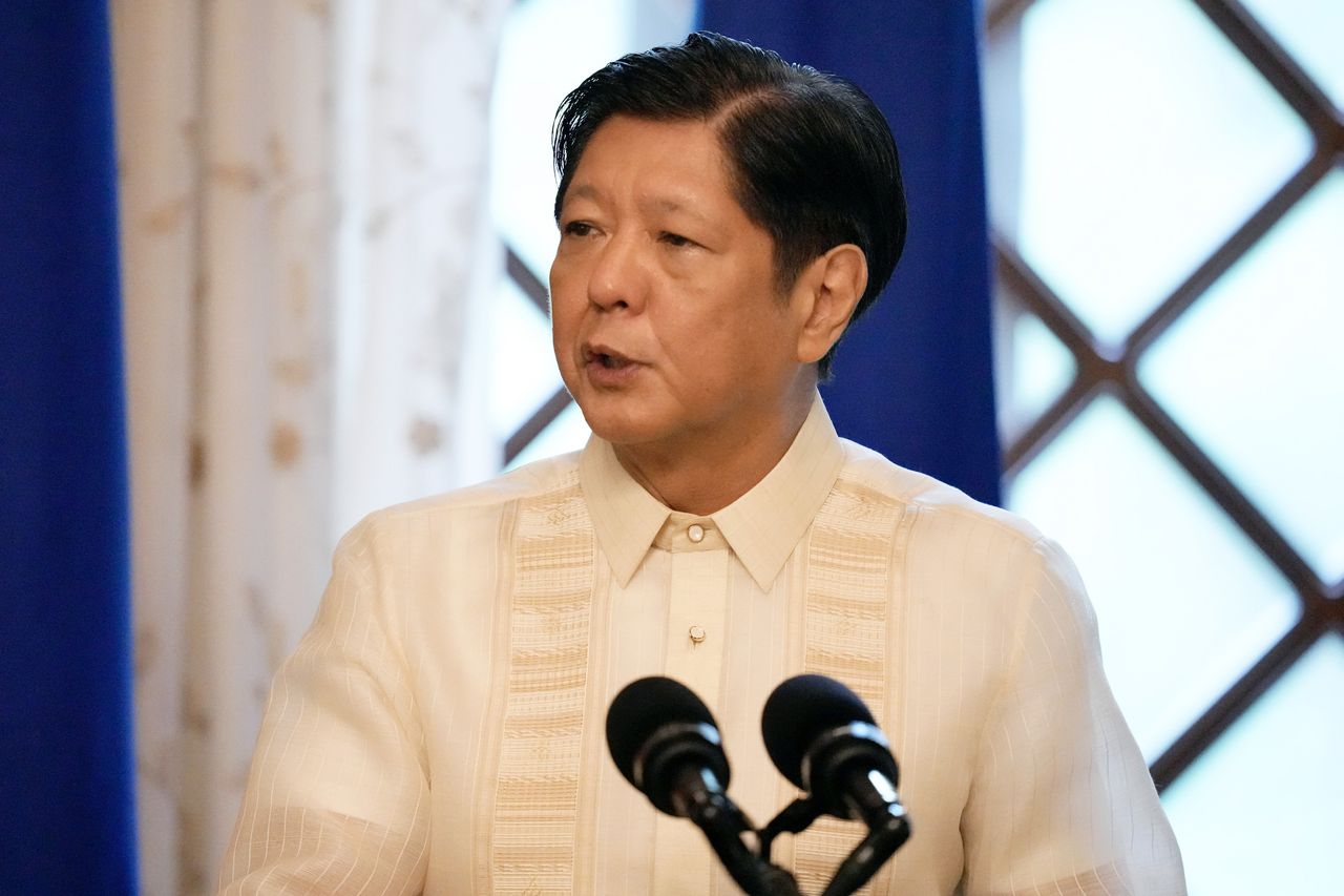 菲律賓總統小費迪南德·馬科斯對美國和中國的方式與他的前任形成對比。照片:Aaron favila/Press pool/Shutterstock由補給船上的一名船員拍攝並由菲律賓武裝部隊分享給《華爾街日報》的視頻片段顯示,一艘中國海警船向船隊噴射水流。水流擊中船隻,發出巨大的撞擊聲,導致船隻搖晃。
