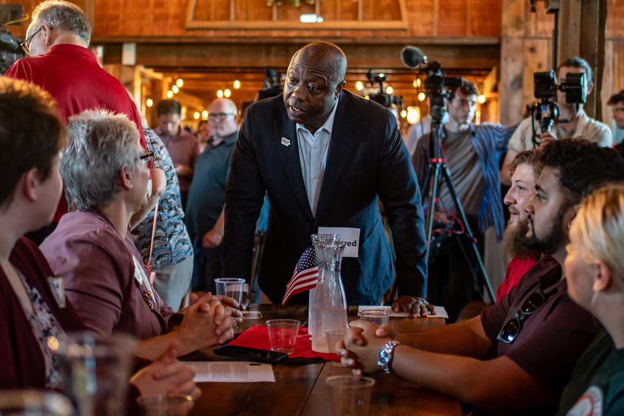 參議員蒂姆·斯科特上週在愛荷華州爭取選民。圖片來源:Sergio Flores for The Wall Street Journal德桑蒂斯開始更猛烈抨擊特朗普,包括指責其未能兑現2016年改革司法體系的競選承諾。這種策略旨在打擊特朗普的同時,仍能吸引那些認為特朗普被起訴不公的選民。