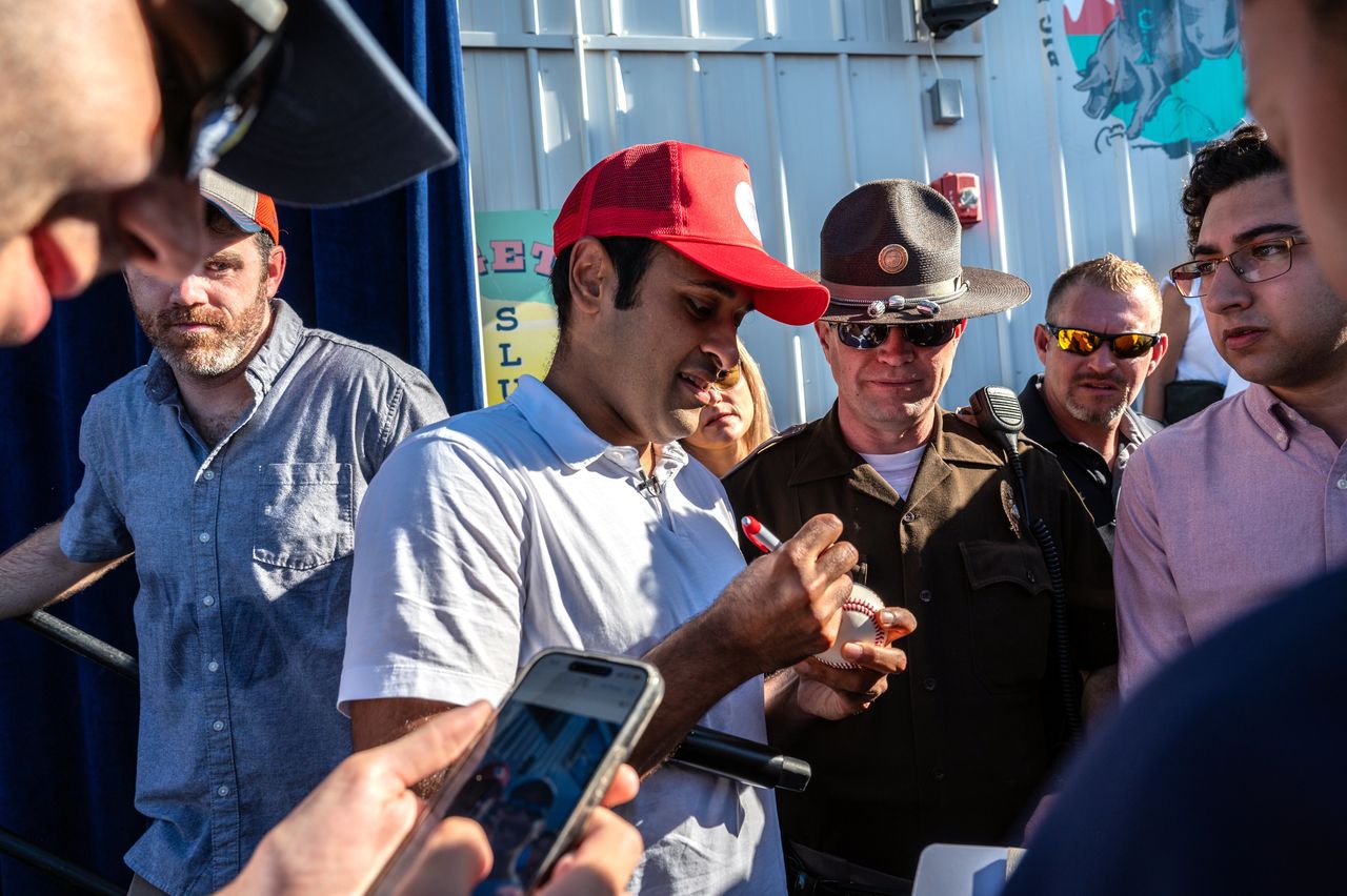 生物科技公司創始人維韋克·拉馬斯瓦米在民調中支持率持續上升。圖片來源:Sergio Flores/華爾街日報週四,《紐約時報》報道了一份由支持德桑蒂斯的超級政治行動委員會制定的辯論策略備忘錄。其中一項建議是:如果克里斯蒂攻擊特朗普,就要為特朗普辯護。另一項建議是針對維韋克·拉馬斯瓦米,這位生物科技公司創始人在知名度不高的情況下參選後,民調支持率不斷上升。