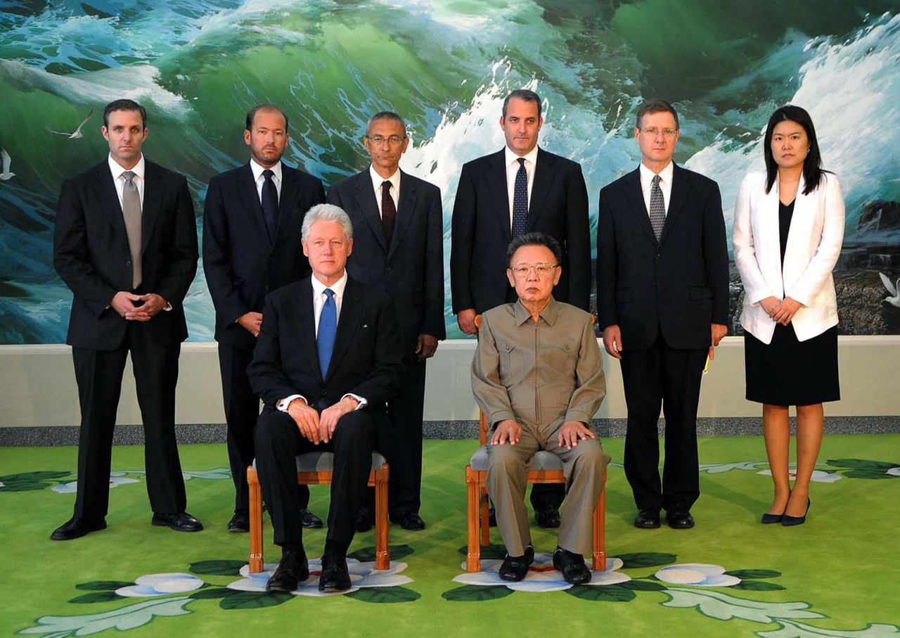 2009年,美國前總統比爾·克林頓(Bill Clinton)訪問平壤,與朝鮮時任領導人金正日(Kim Jong Il)會面,以確保兩名美國記者獲釋。圖中坐着並打着領帶的是克林頓。圖片來源:KCNA via KNS/Agence France-Presse/Getty Images2009年,美國前總統克林頓訪問平壤以解救兩名美國記者時,他向朝鮮時任領導人金正日強調,他是以私人身份到訪,並未獲授權進行外交活動。