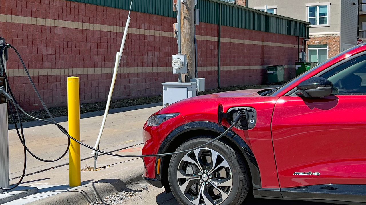 4月21日,堪薩斯州恩波里亞市充電站的一輛福特野馬電動車。攝影:馬克·萊因斯坦/祖瑪通訊社刊登於2023年8月26日印刷版,標題為《為何我們的電動車政策如此極端愚蠢》。