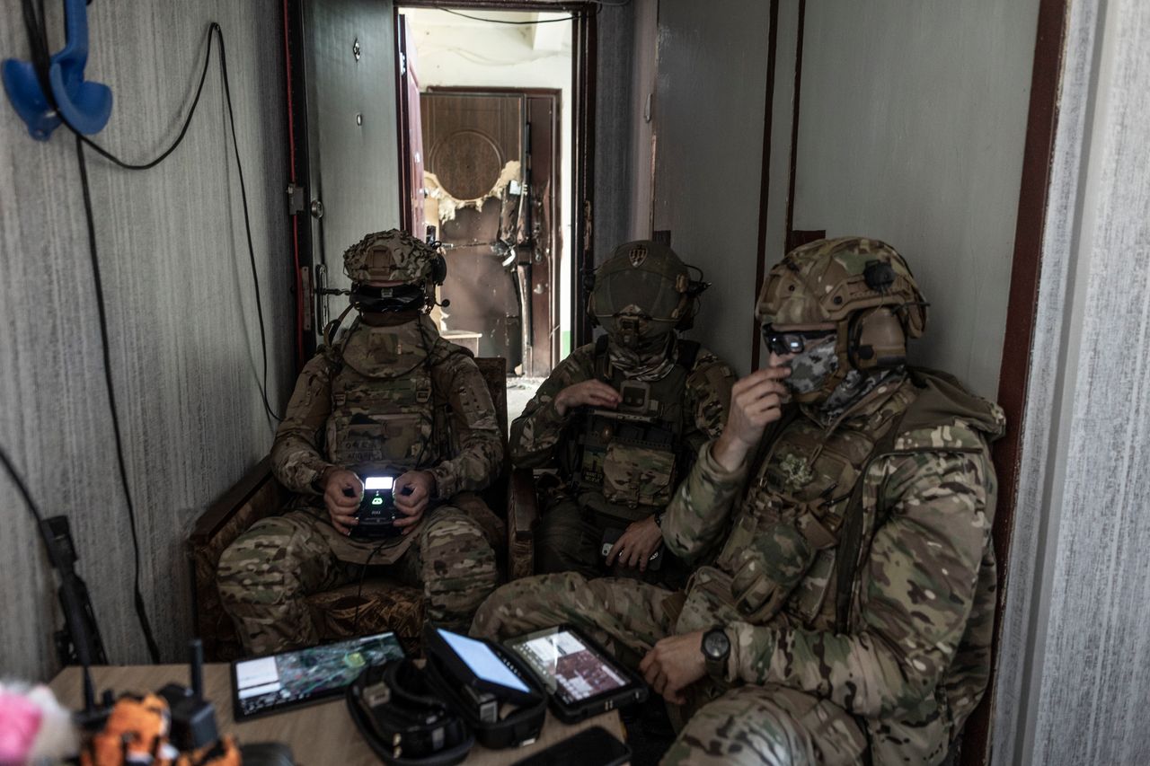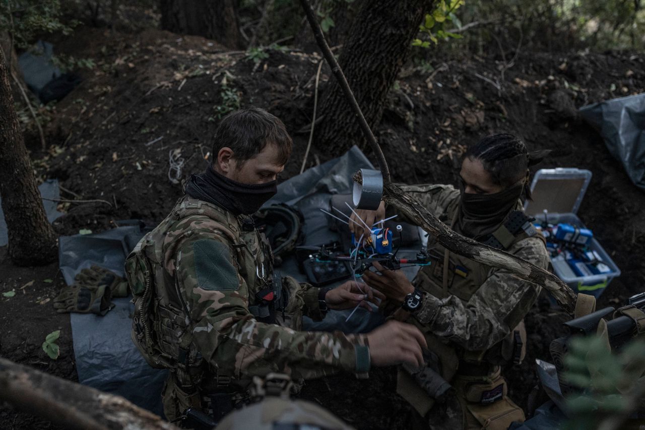 技術的運用正在改變烏克蘭的作戰方式。A中心士兵在烏克蘭恰西夫亞爾附近準備發射一架FPV無人機。
