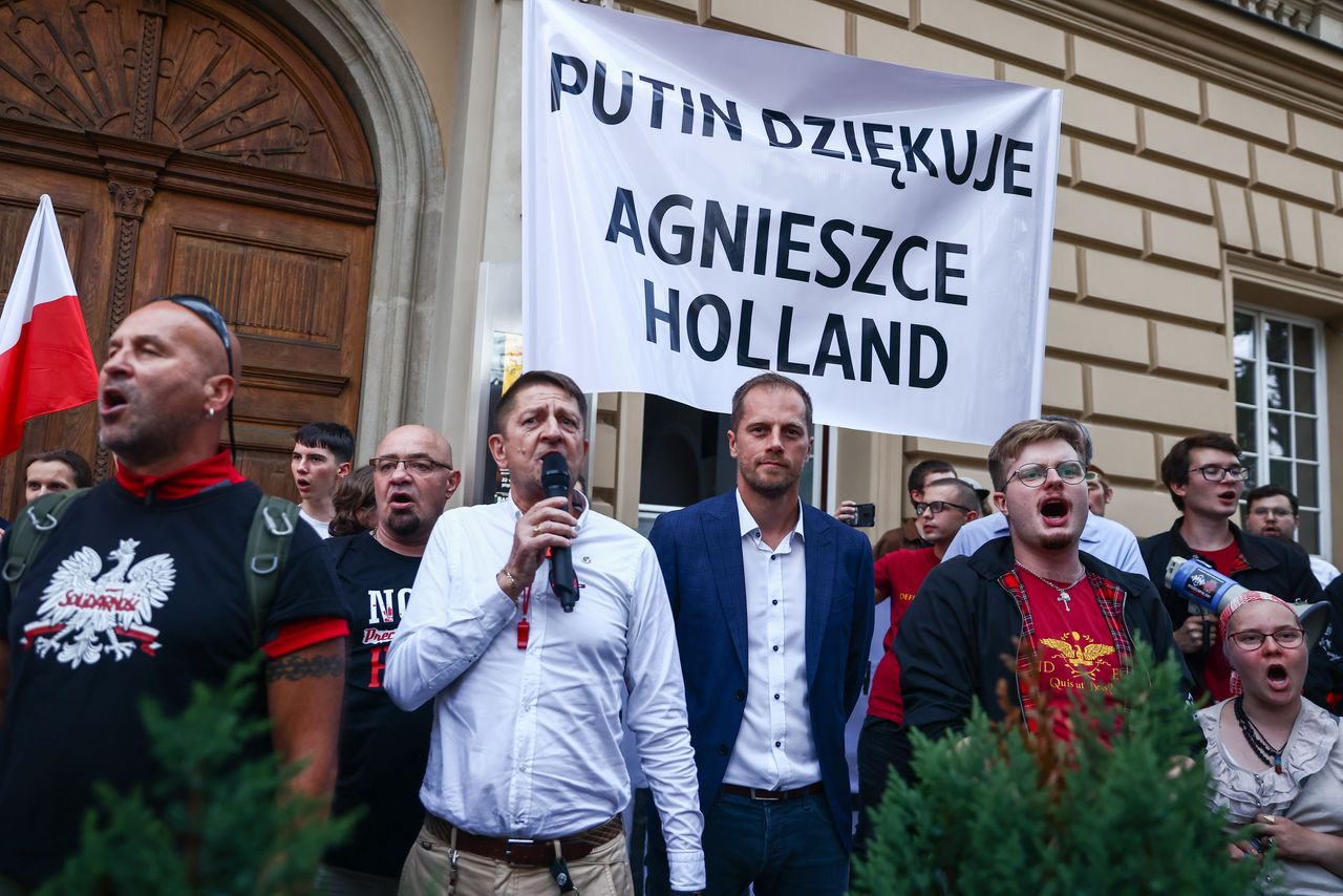 波蘭克拉科夫一場反對導演阿格涅絲卡·霍蘭新片《綠色邊境》的示威活動中,橫幅寫着"普京感謝阿格涅絲卡·霍蘭”。圖片來源:貝婭塔·扎維爾/努爾圖片/蓋蒂圖片社盧卡申科的手段在波蘭引發了反移民情緒浪潮,霍蘭電影的批評者再次煽動這種情緒——該片本月獲得威尼斯國際電影節評審團特別獎令他們憤怒不已。