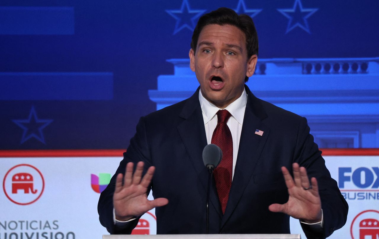佛羅里達州州長羅恩·德桑蒂斯於週三在加州西米谷的羅納德·里根總統圖書館舉行的第二場共和黨候選人辯論中發言。圖片來源:MIKE BLAKE/路透社刊載於2023年9月29日印刷版,標題為《德桑蒂斯持續迴避烏克蘭問題》。
