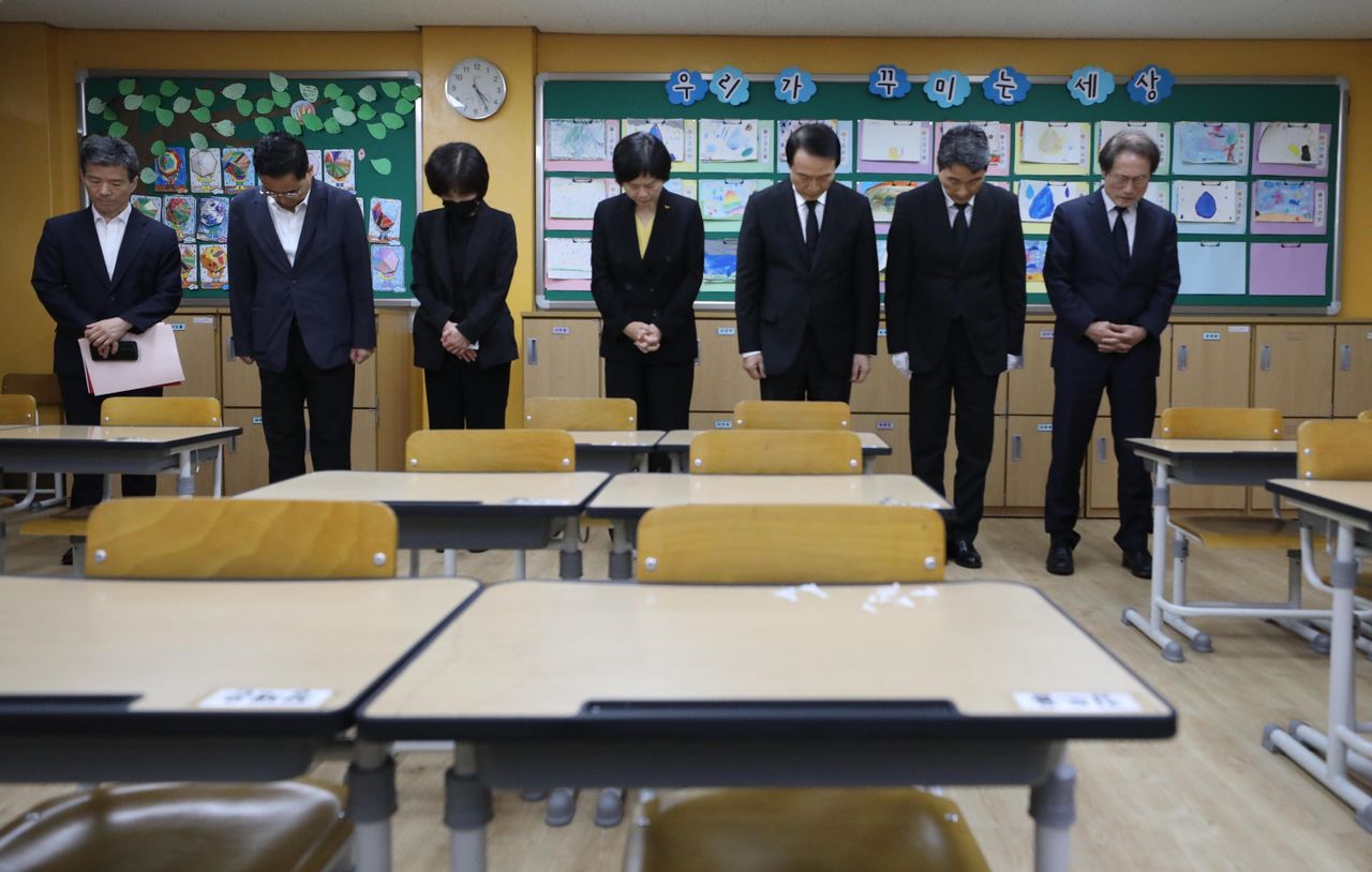 9月4日,首爾市教育監趙顯旼(音)繫着領帶、雙手交握,與其他官員在這位教師去世的學校舉行"四九祭”(韓國傳統中逝者第四十九日的追思儀式)。圖片來源:聯合新聞/ZUMA通訊社首爾市教育廳報告顯示,2018至2022年間全國約有1200起針對教師的訴訟。教師團體稱,這些訴訟涉及教師提高嗓門、制止暴力學生、將擾亂課堂者帶離教室等行為。據韓國教師與教育工作者工會統計,其中僅1.5%的案件最終被刑事起訴。