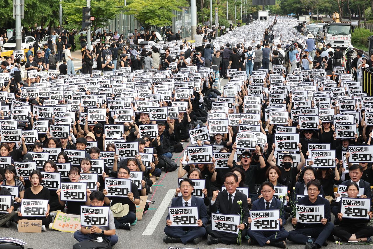 9月4日的大規模教師集會致使課堂空無一人。照片:韓聯社/祖瑪通訊社這起事件引發教師抗議活動,包括最近一場示威中身着黑衣的抗議者高呼"我們要活下去”。一羣師範專業大學生指責政府存在制度性問題,稱這起自殺是"社會性過失殺人”。