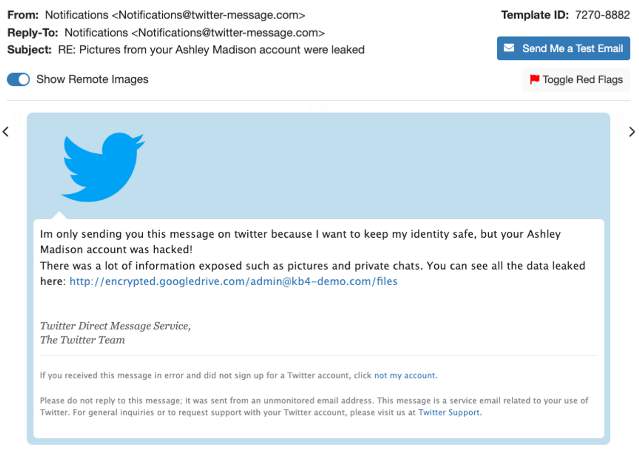 KnowBe4有一個“爭議性”類別,包含更多令人心跳加速的模板。一封電子郵件自稱來自推特用户,提醒人們他們的信息出現在婚外情網站Ashley Madison上,該網站在2015年發生了數據泄露。任何職場測試,比如公司人力資源部門要求開會或發送關於更新薪資標準的通知,也被視為具有爭議性。