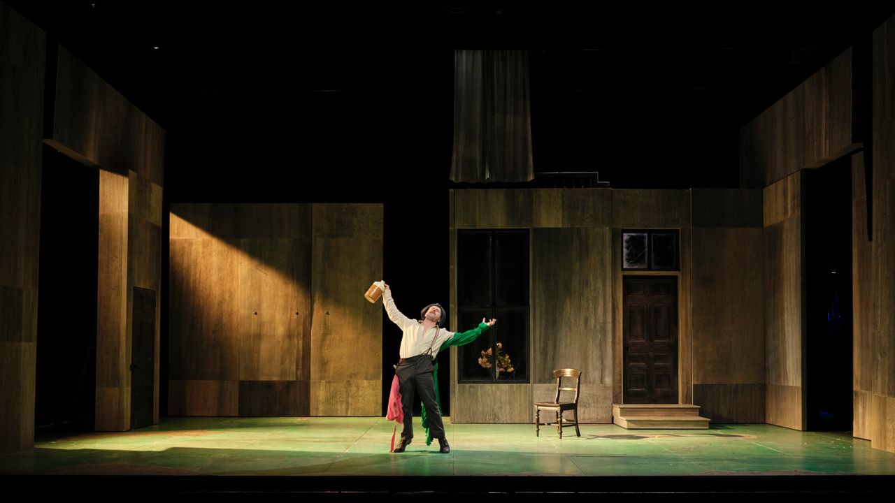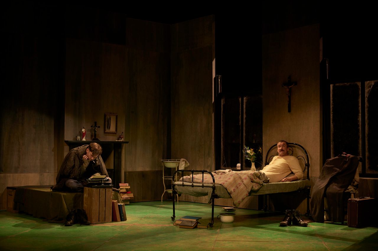 莫納漢先生與凱特芮娜·恩尼斯出演《朱諾與孔雀》攝影:羅斯·卡瓦納作為三部曲終章,《朱諾》(希區柯克曾改編為電影,後登上百老匯音樂劇舞台)以同樣精妙的悲喜交融手法收尾。喜劇效果主要來自諾蘭飾演的"船長"傑克·博伊爾——兼具虛榮與無能的自戀者,與其逃避責任的搭檔、遊手好閒的喬克瑟·戴利(亞倫·莫納漢將"專業幫閒"角色演繹得邪氣十足)的互動。