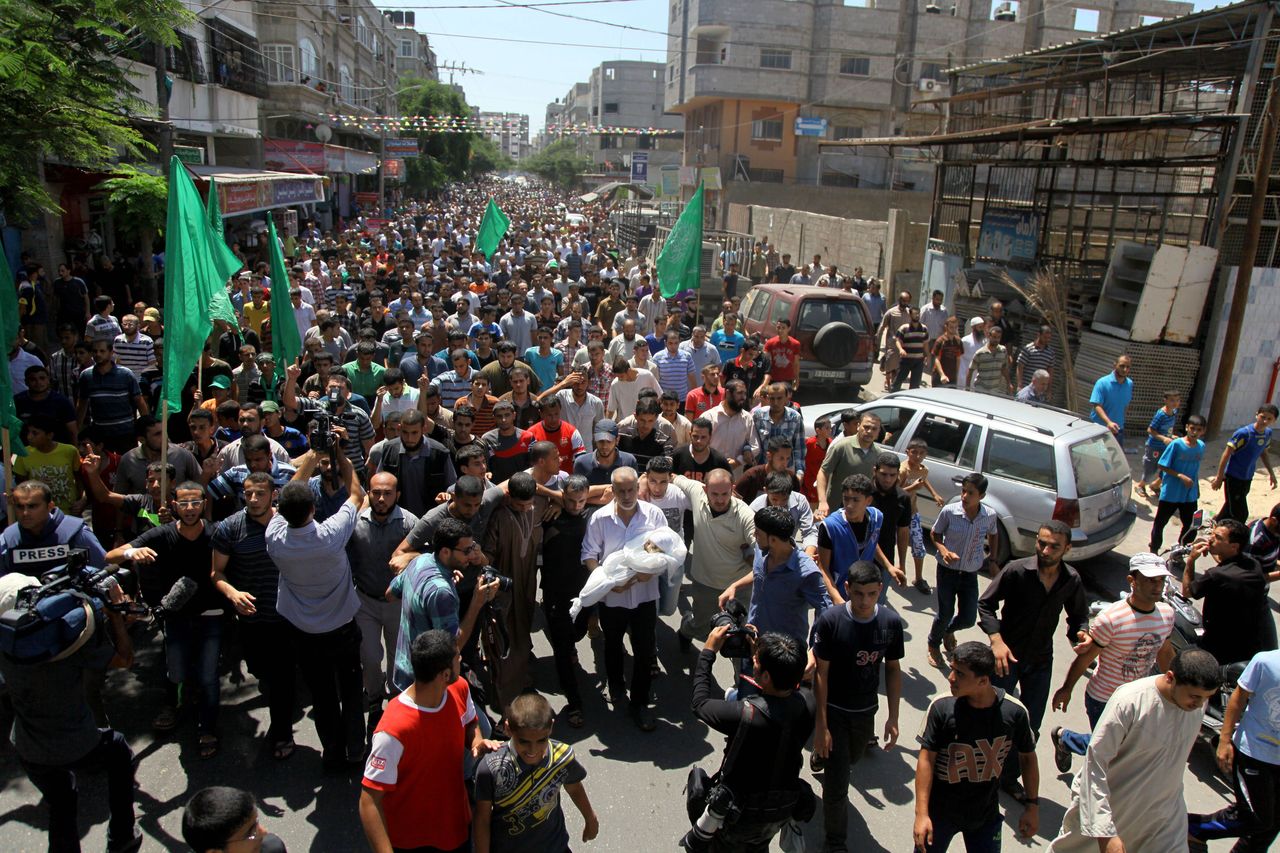 2014年8月,加沙城民眾遊行參加哈馬斯軍事領導人妻兒的葬禮。圖片來源:Ezz Zanoun/Zuma Press但迪夫此後基本隱匿行蹤,直到兩年前突然現身,通過廣播就耶路撒冷巴勒斯坦民居爭端發聲。哈馬斯從加沙發射火箭彈,引發持續11天、撼動以色列內部的衝突。