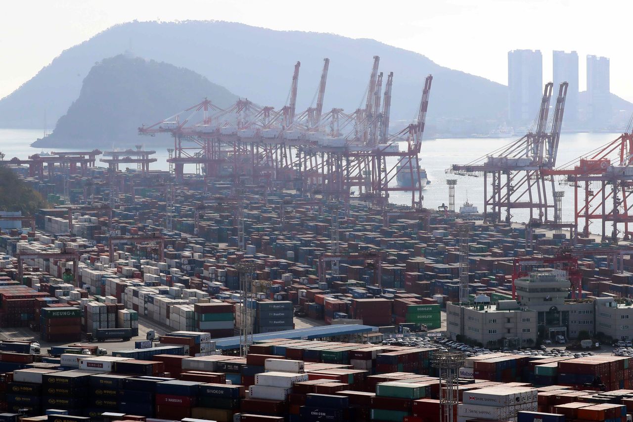 2022年12月,堆積的集裝箱填滿了韓國釜山港。圖片來源:河京敏/美聯社刊載於2023年10月13日印刷版,原題為《氣候變化與"貧窮"的韓國》。