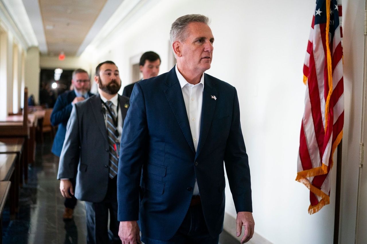 眾議員凱文·麥卡錫(加利福尼亞州共和黨人)週五從共和黨會議中走出來;共和黨爭奪新議長的混戰始於上週他被免去該職位。照片:Al Drago/彭博新聞社在週五的計票中,喬丹未能獲得確保共和黨在眾議院全院投票中勝出所需的217票。雖然當時僅有約209名共和黨人出席使得這一目標無法實現,但結果也暴露出該黨更廣泛的問題:在221-212席的微弱優勢分化的眾議院中,若全體議員到場並投票選舉議長,共和黨最多隻能失去四張選票。