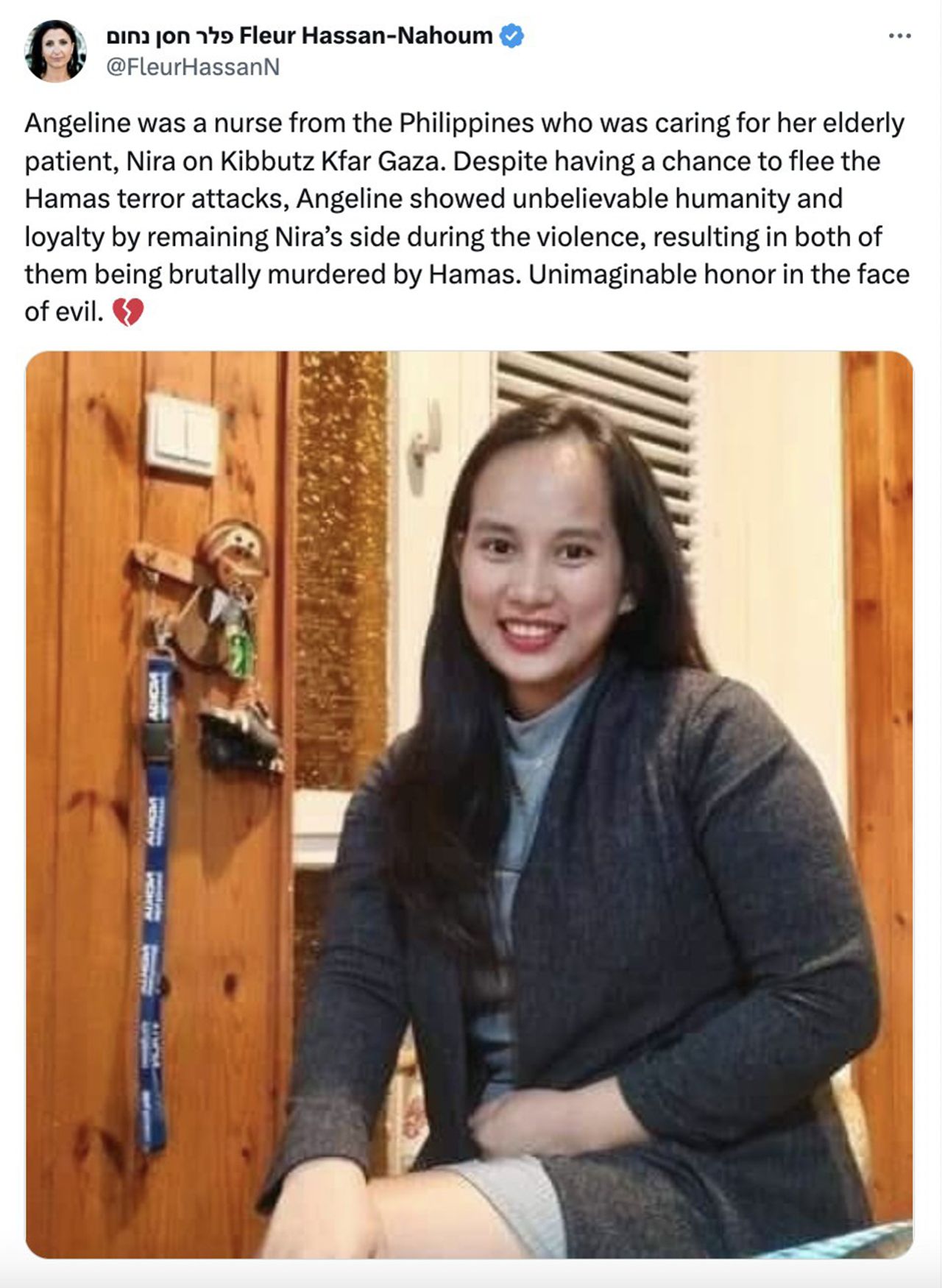 我的社交媒體動態充斥着來自以色列的壞消息,但耶路撒冷副市長週一的一條推文比其他消息更猛烈地撕裂了我的心。推文講述了一位來自菲律賓的護士——僅被稱為"安吉琳",照片中綻放的笑容與這個甜美名字相得益彰——在距離加沙三公里的基布茲被哈馬斯殺害。她當時正在照料一位同樣遇害的以色列老婦人。推文稱安吉琳"儘管有機會逃跑",卻始終守護在病人身邊。