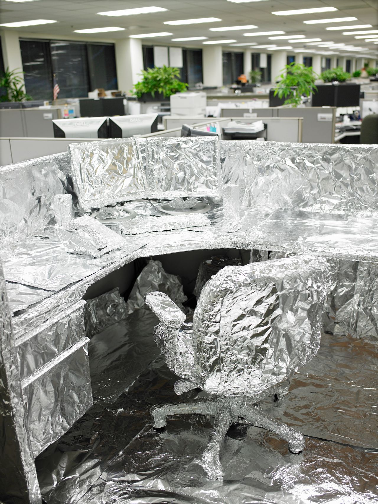 高複雜性與低破壞性的比例有助於贏得讚賞。當福斯特這樣的機靈鬼用報紙或鋁箔包裹同事辦公室的每件物品時,結果看起來就像一個很酷的藝術裝置。