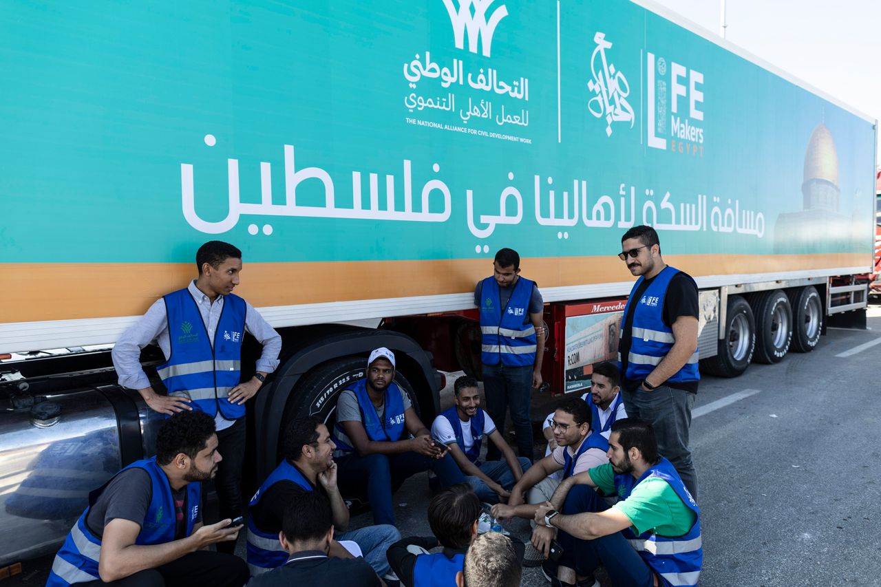 週日,埃及境內滿載援助物資的志願者車隊等待進入加沙。圖片來源:Mahmoud Khaled/Getty Images