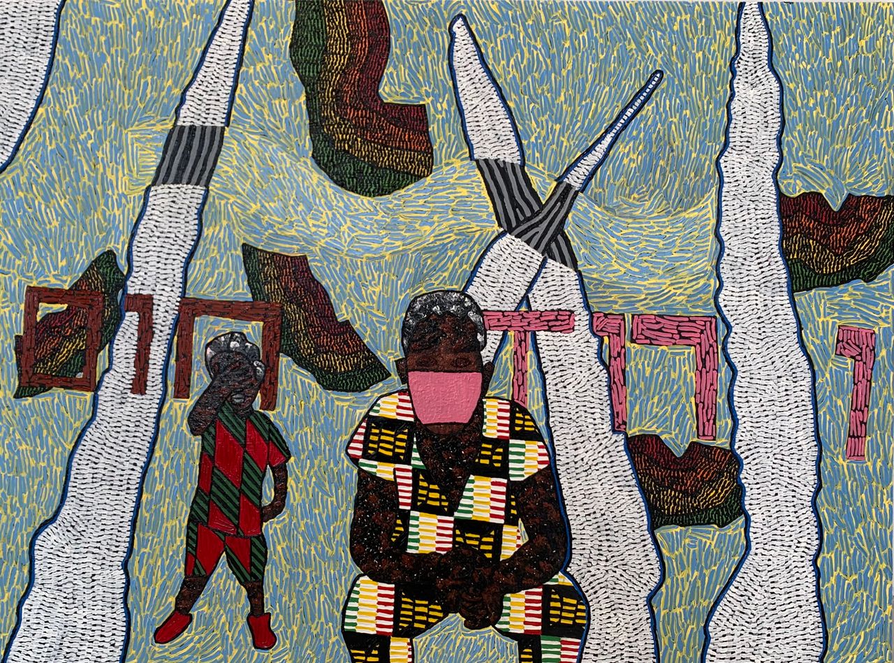 我在特拉維夫的阿隆·塞格夫畫廊發現了這位藝術家的作品,其作品被以色列眾多機構收藏。我常覺得以色列藝術家在國際上被忽視,部分原因是以色列常被視為一個被抵制的實體,其藝術也備受質疑,因此每次到這個國家我都會逛遍畫廊。塔爾那些用大膽色彩和孩童般象形符號風格創作的作品瞬間吸引了我,讓我想起像亨利·達格和吉米·李·薩達斯這樣的局外人藝術家——他們未經專業訓練,創作遊離於傳統藝術規範之外。她將畫布填滿邊緣的方式令人聯想到局外人藝術家的"空白恐懼”,並大量重複圖像元素。她畫中的人偶、玩具和身體部位點綴着黑點,如同圖形化的麻疹,後來我才知道這些黑點象徵塔爾自身罕見的皮膚疾病——痣,也是對人類差異性的致敬。她還頻繁使用巴勒斯坦國旗的綠、白、紅三色。塔爾的核心關注點是心理與生理上的"他者性",以及如何消除對所謂敵人(無論是阿拉伯人還是以色列人)的他者化。