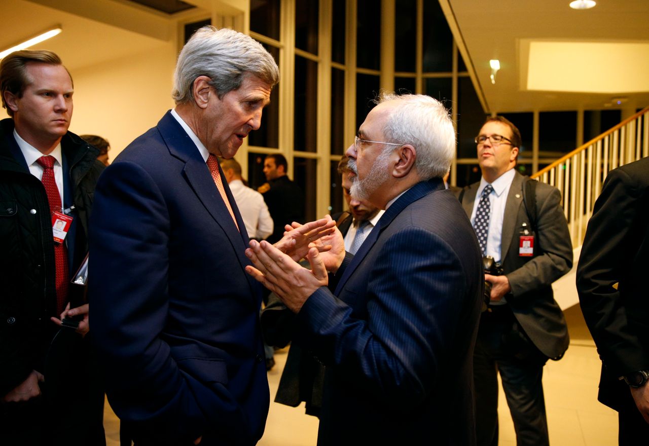 2016年1月16日,美國國務卿約翰·克里在維也納與伊朗外交部長穆罕默德·賈瓦德·扎裏夫交談。圖片來源:凱文·拉馬克/美聯社刊載於2023年10月17日印刷版,標題為《安撫伊朗已告失敗》。