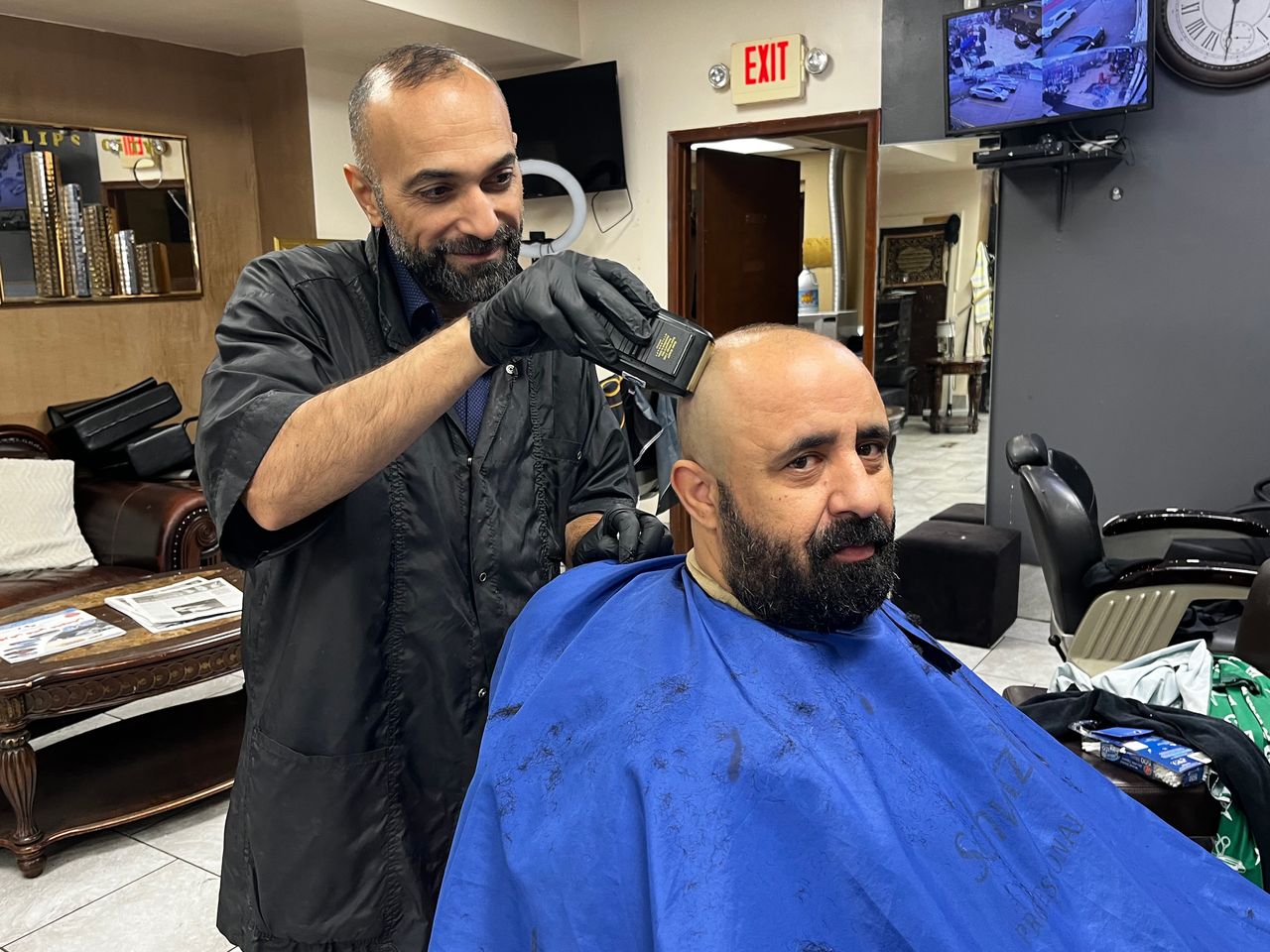 薩迪克·穆斯萊赫正在理髮師海德爾·阿巴斯的店裏剪髮,他表示抗議活動中居民們"説完想説的話就回家”。圖片來源:喬·巴雷特/華爾街日報"迪爾伯恩的警察非常棒,他們保護民眾。他們確實追捕並抓獲了兇手,“36歲的巴勒斯坦裔美國教師肖魯克·哈耶克説。週六下午她帶着三個孩子參加了城市公園舉行的"全力支持巴勒斯坦"集會。數百人揮舞巴勒斯坦旗幟,高呼"被佔領時,抵抗有理”。