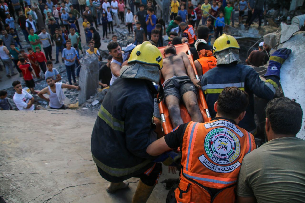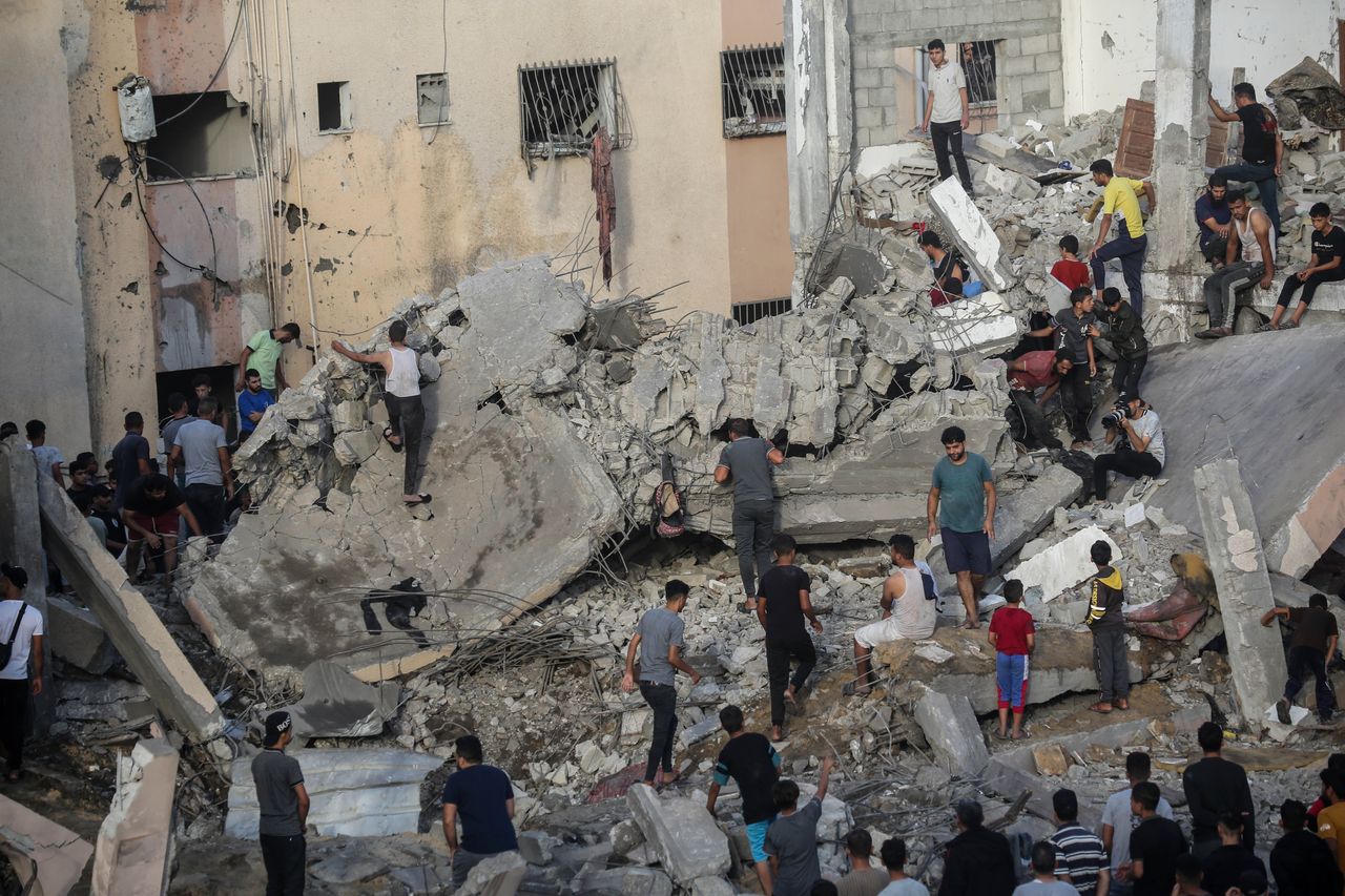 人們在加沙南部遭以軍空襲摧毀的建築中搜尋遇難者。圖片來源:Ahmad Hasaballah/Getty Images