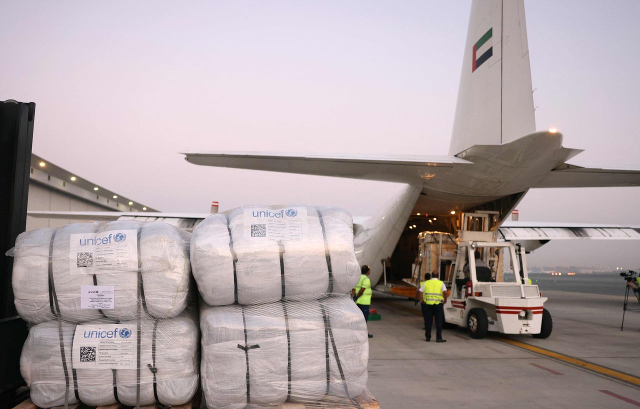 迪拜機場,工作人員正在裝載運往加沙的援助物資。圖片來源:卡里姆·薩希布/法新社/蓋蒂圖片社