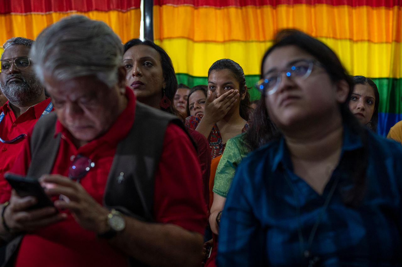 週二,孟買的LGBTQ羣體支持者與成員們正在觀看最高法院關於同性婚姻合法化的裁決。圖片來源:Rafiq Maqbool/美聯社印度最高法院週二裁定反對同性婚姻合法化,破滅了數百萬LGBTQ人士在這個全球人口最多國家實現身份與權利重大變革的希望。