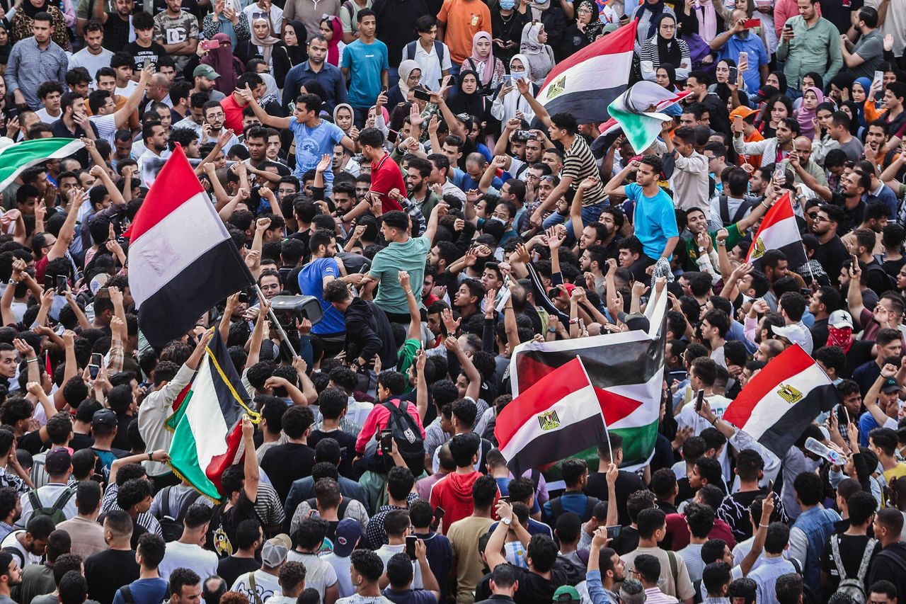 週三,抗議者在埃及吉薩揮舞埃及和巴勒斯坦國旗。圖片來源:Stringer/Zuma Press