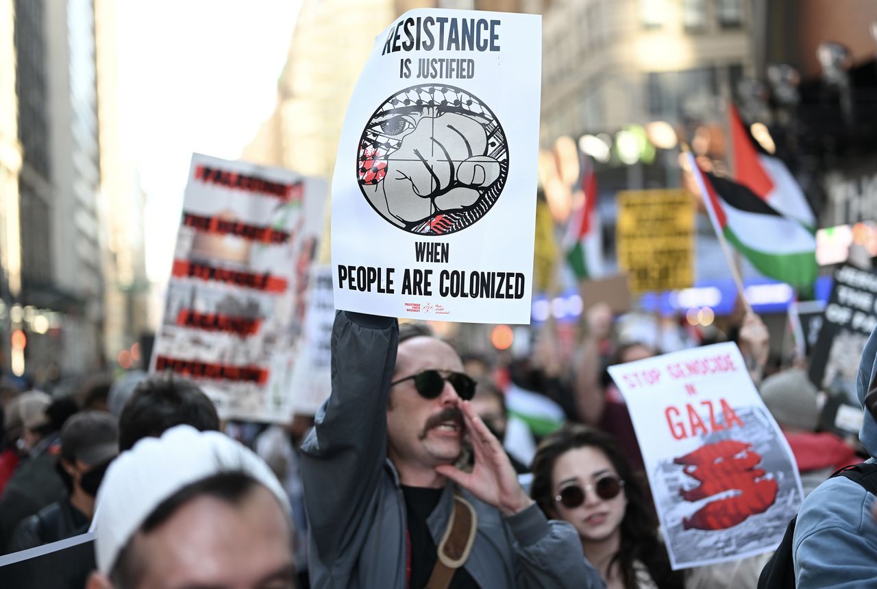 10月13日,紐約時代廣場上支持巴勒斯坦的示威活動,發生在哈馬斯襲擊以色列後的幾天內。圖片來源:Fatih Aktas/Anadolu via Getty Images刊登於2023年10月19日印刷版,標題為《陀思妥耶夫斯基的預見:此地亦可能發生》。