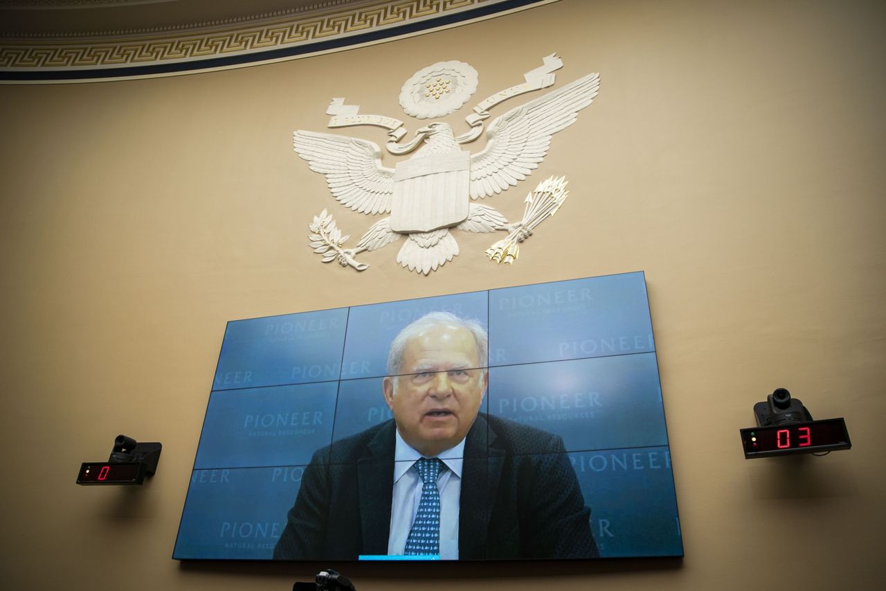 斯科特·謝菲爾德去年在華盛頓舉行的眾議院能源和商業小組委員會會議上通過視頻發言。圖片來源:阿爾·德拉戈/彭博新聞疫情封鎖和2020年油價暴跌導致數十家頁岩公司破產。憑藉強化的資產負債表,先鋒公司處於收購競爭對手的有利位置,並在2021年連續收購了二疊紀盆地鑽探公司DoublePoint Energy和Parsley Energy——後者由謝菲爾德的兒子布萊恩(五個孩子之一)擁有,總交易額為110億美元。
