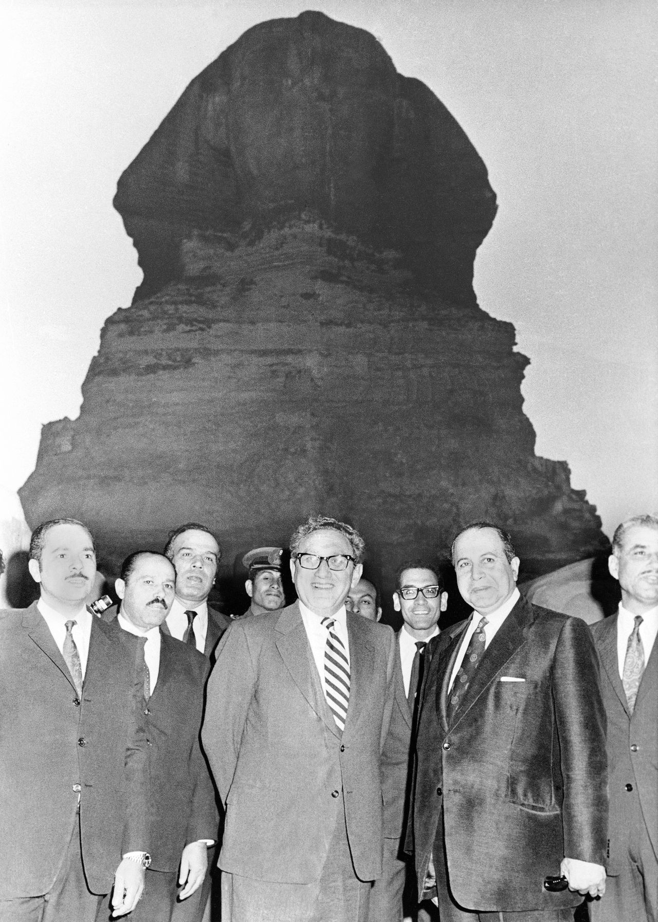 1973年11月7日,美國國務卿亨利·基辛格在贖罪日戰爭後赴埃及進行和平調解之旅,於獅身人面像前留影。照片:美聯社一旦局勢穩定下來,當恢復到接近10月7日前的現狀時,美國外交應轉向第二階段,即重新推動以色列與沙特阿拉伯、以及以色列與那些願意放棄恐怖主義的巴勒斯坦人之間的關係正常化。這種兩階段的做法讓人想起50年前埃及和敍利亞在贖罪日戰爭中對以色列發動突襲後發生的情況。